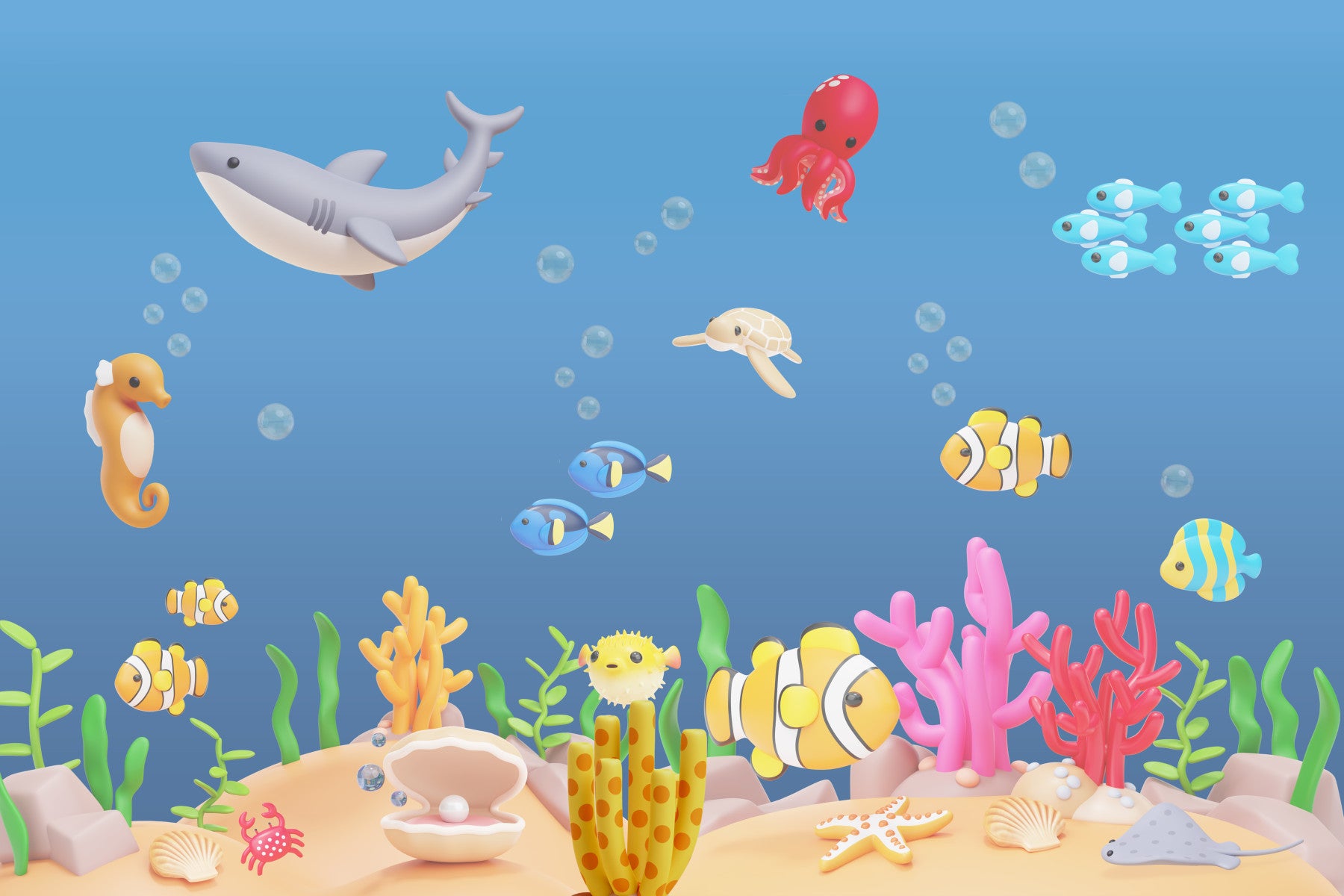 Dive into a world of underwater wonder with this charming wallpaper for walls! Featuring friendly sea creatures like clownfish, sharks, and turtles swimming amongst colorful coral reefs, this design brings an ocean adventure to any room. The playful cartoon style and pastel hues make it ideal for a kid's room or nursery. Let the sea life theme inspire curiosity and create a calming, cheerful atmosphere in your home.