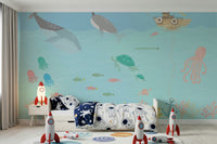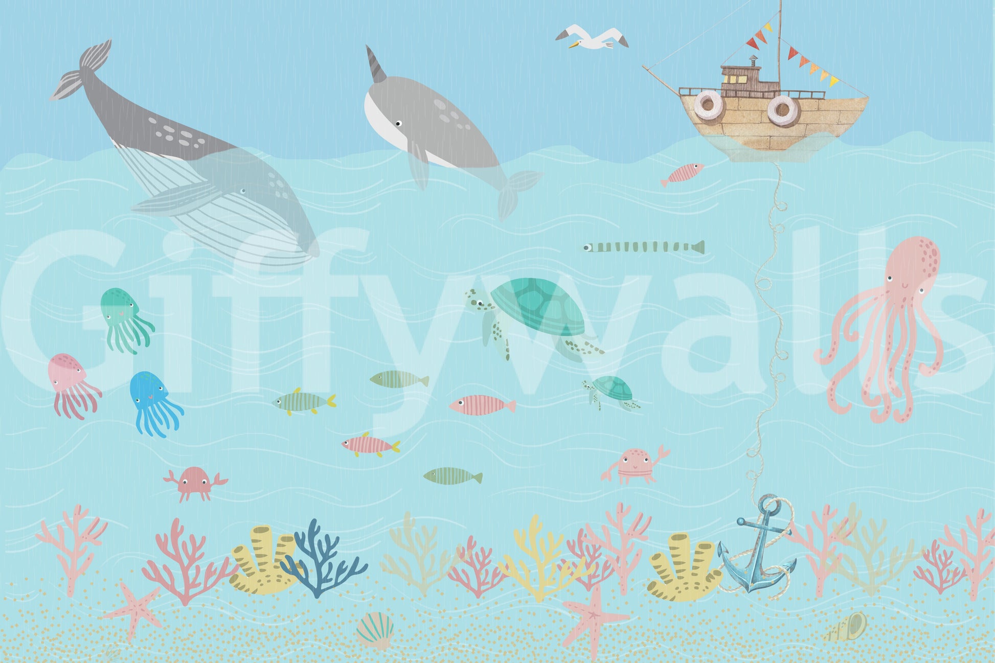 Dive into a playful underwater world with this charming wallpaper for walls. Whales, octopuses, and sea turtles swim among colorful corals and a whimsical boat. This design features soft pastel hues of blue, pink, and green, creating a calming and cheerful atmosphere. Ideal for a kids room, nursery, or bathroom, this wallpaper brings a touch of the ocean's magic into your home. It complements interiors with its lighthearted theme.