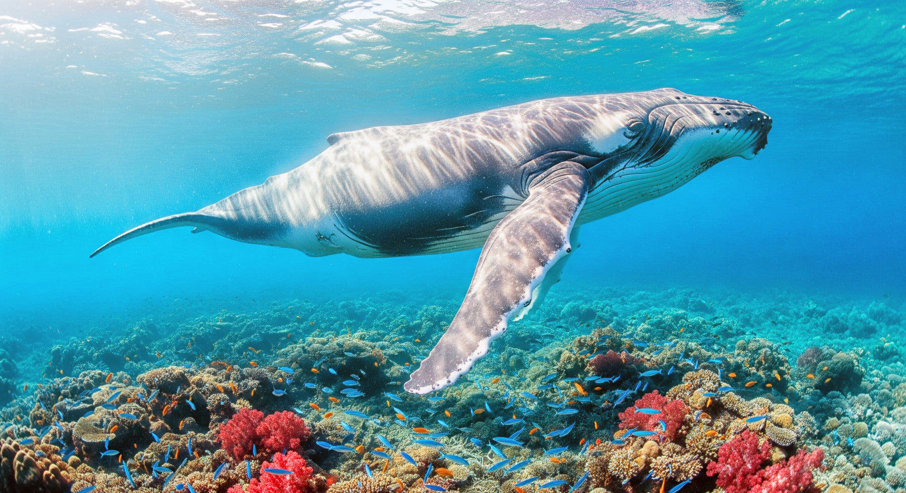 Dive into a world of wonder with this breathtaking wallpaper for walls. The image captures a majestic whale gracefully swimming above a vibrant coral reef. The blue hues of the ocean contrast beautifully with the colorful coral, creating a captivating visual experience. This design adds a sense of serenity and grandeur to living rooms, bedrooms, or any space seeking a touch of underwater magic. It transforms your interior with a stunning marine landscape.