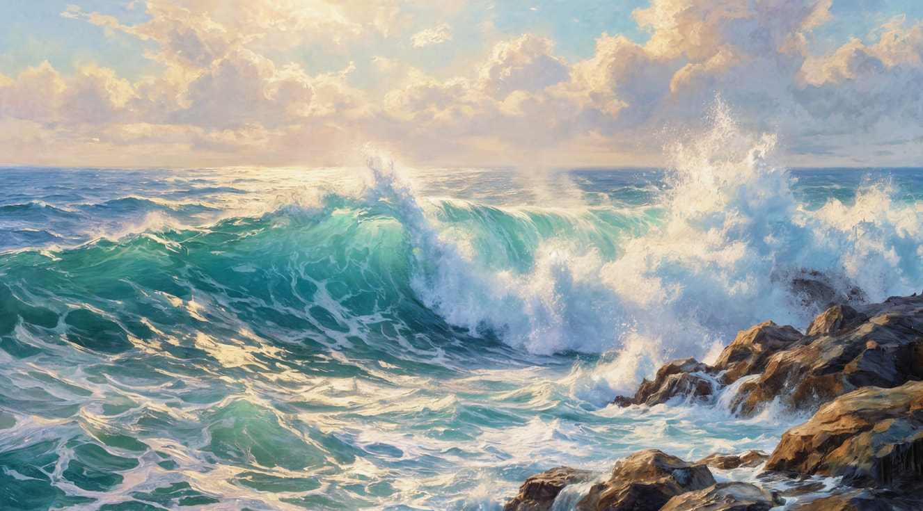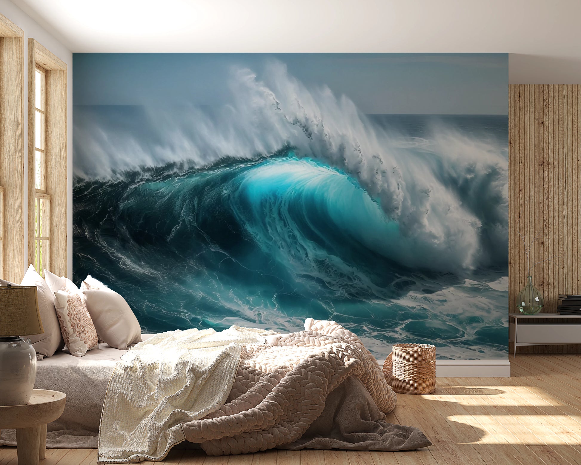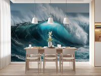 Bring the power of the ocean into your space with this dynamic wallpaper for walls. The stunning image captures a massive wave as it crests, showcasing the raw energy and beauty of the sea. The color palette ranges from deep blues and teals to bright whites, offering a striking visual impact. This wallpaper works beautifully in living rooms, hallways, or bathrooms, adding a sense of drama and depth. The detailed textures and dynamic composition make the wall feel alive. It complements minimalist, modern, or coastal-themed interiors, creating an atmosphere of freedom and adventure.