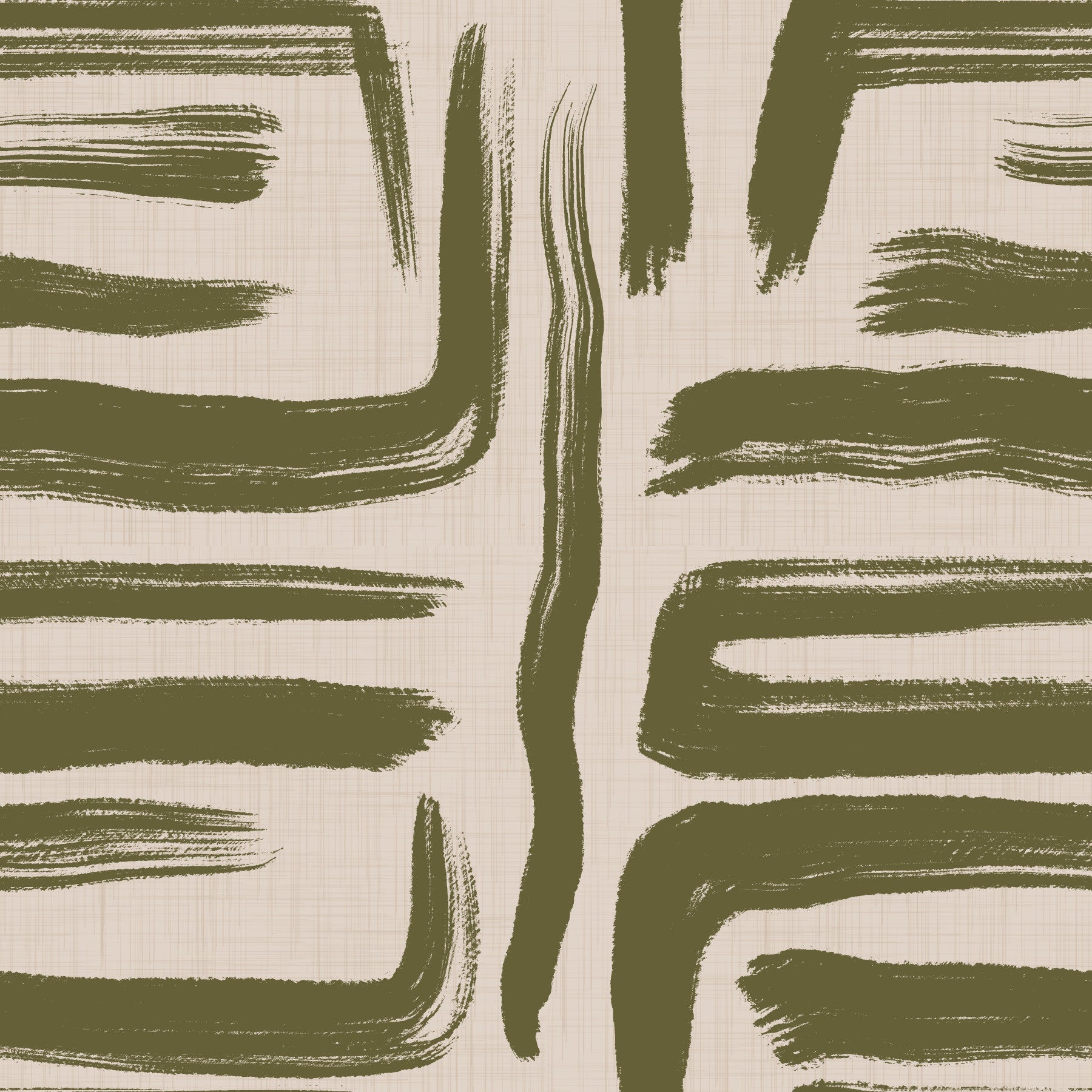 Embrace mid-century modern style with this captivating wallpaper. Bold, olive green brushstrokes in varying widths and directions create a dynamic, abstract pattern against a subtle beige linen texture. The interplay of organic brushwork and geometric undertones evokes a sense of calm sophistication. This design effortlessly blends organic texture with clean lines, making it a perfect choice for adding a touch of artistic flair to any space, from a living room to a home office. The earthy olive tones create a soothing atmosphere, while the dynamic brushstrokes add visual interest and a modern edge.