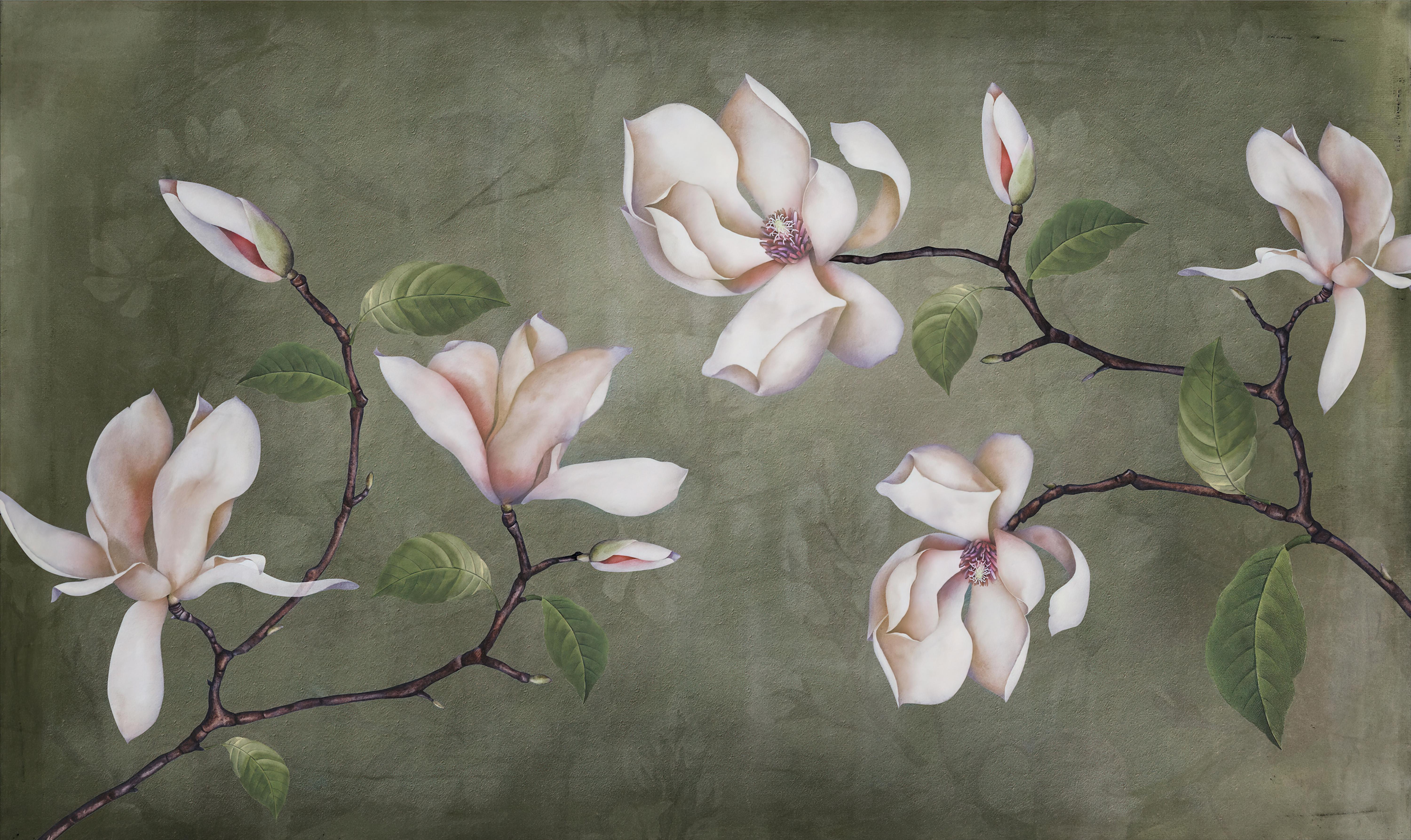 This floral wallpaper brings nature's charm indoors with delicate magnolia blossoms set against a rich olive-green backdrop. The soft petals and intricate branch details create a timeless botanical aesthetic, perfect for bedrooms, living rooms, or accent walls. The earthy green tones provide a soothing effect while adding depth to any space. This high-quality wallpaper is Designed for modern and classic interiors and ensures durability and a seamless finish. Whether creating a cozy retreat or a refined statement wall, this floral wallpaper offers a graceful blend of elegance and nature's beauty, making every wall a captivating focal point.