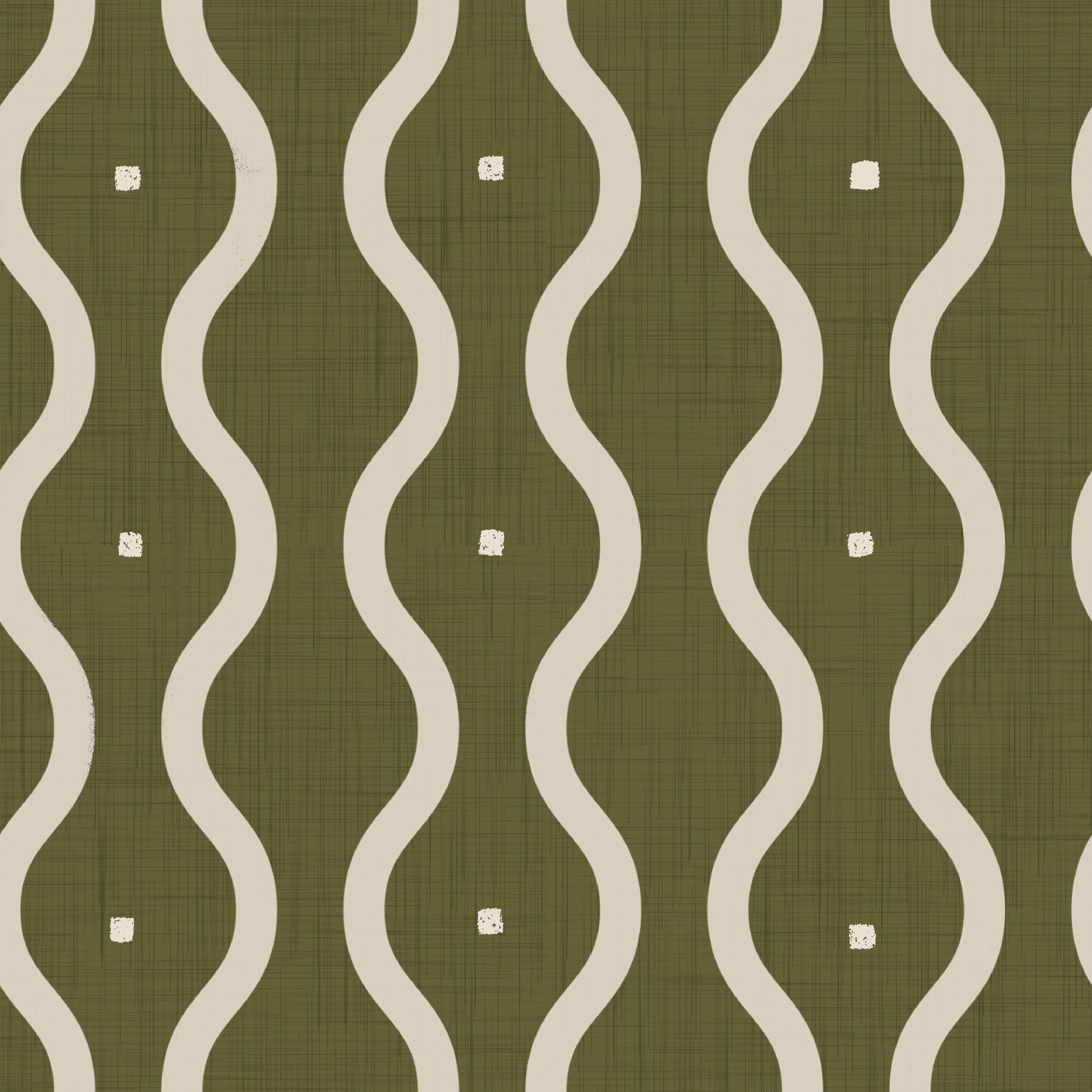 Bring a touch of nature-inspired design indoors with this unique wavy pattern. The olive-green backdrop and cream-colored waves create a calming, harmonious feel. Tiny square details add a subtle geometric touch. This wallpaper for walls easily enhances living rooms, bedrooms, or hallways. It pairs beautifully with natural wood furniture and earthy tones, infusing spaces with a sophisticated yet relaxed atmosphere.