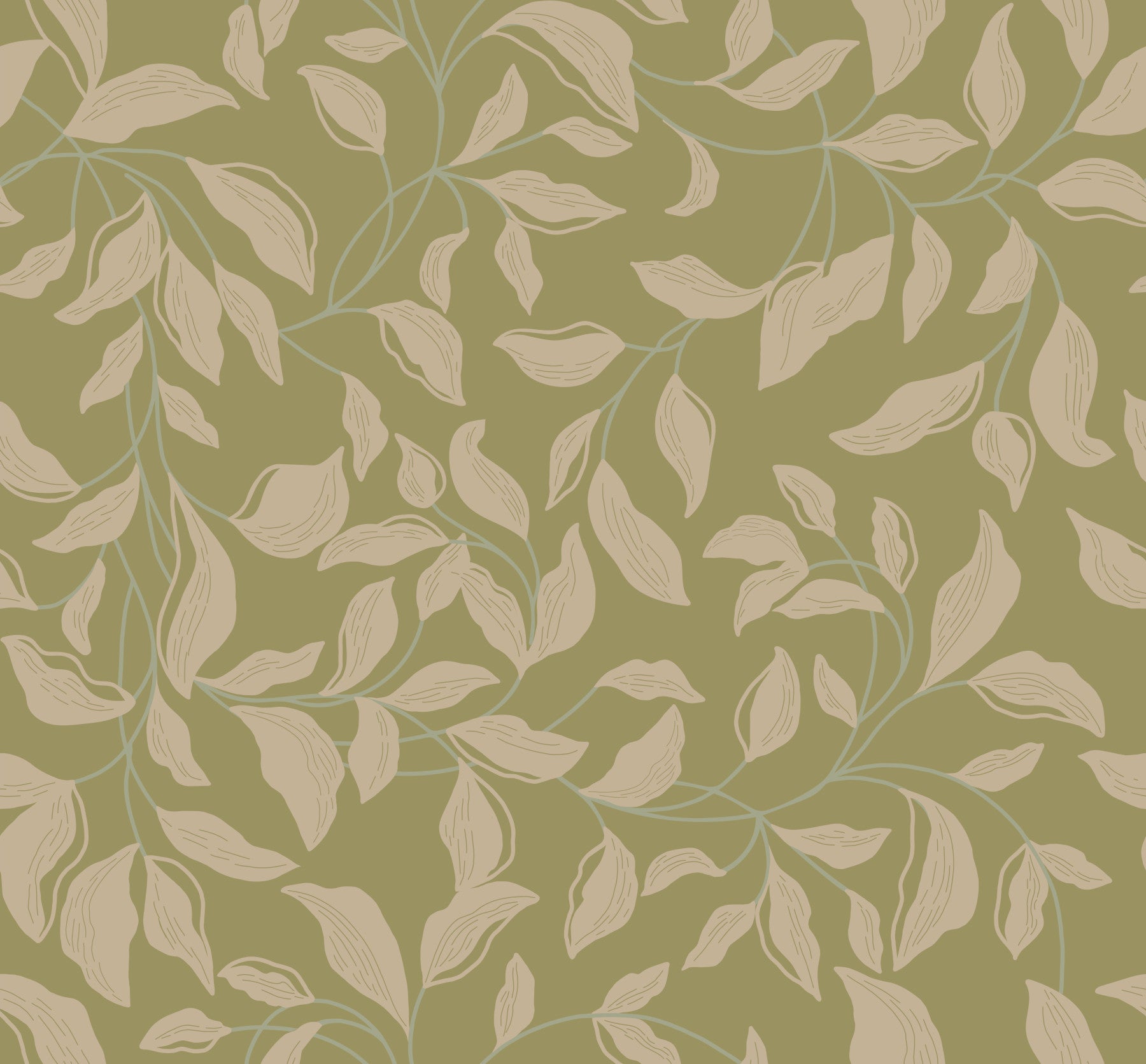 Bring nature indoors with this serene leaf design. This wallpaper for walls shows a repeated pattern of stylized leaves in muted olive and beige tones. A subtle blue-green line outlines the stems, giving a touch of elegance. This wallpaper will look great in bedrooms, living rooms, or hallways. This design offers a soft, relaxing atmosphere, transforming any space into a calming oasis. It pairs well with both modern and rustic interiors.