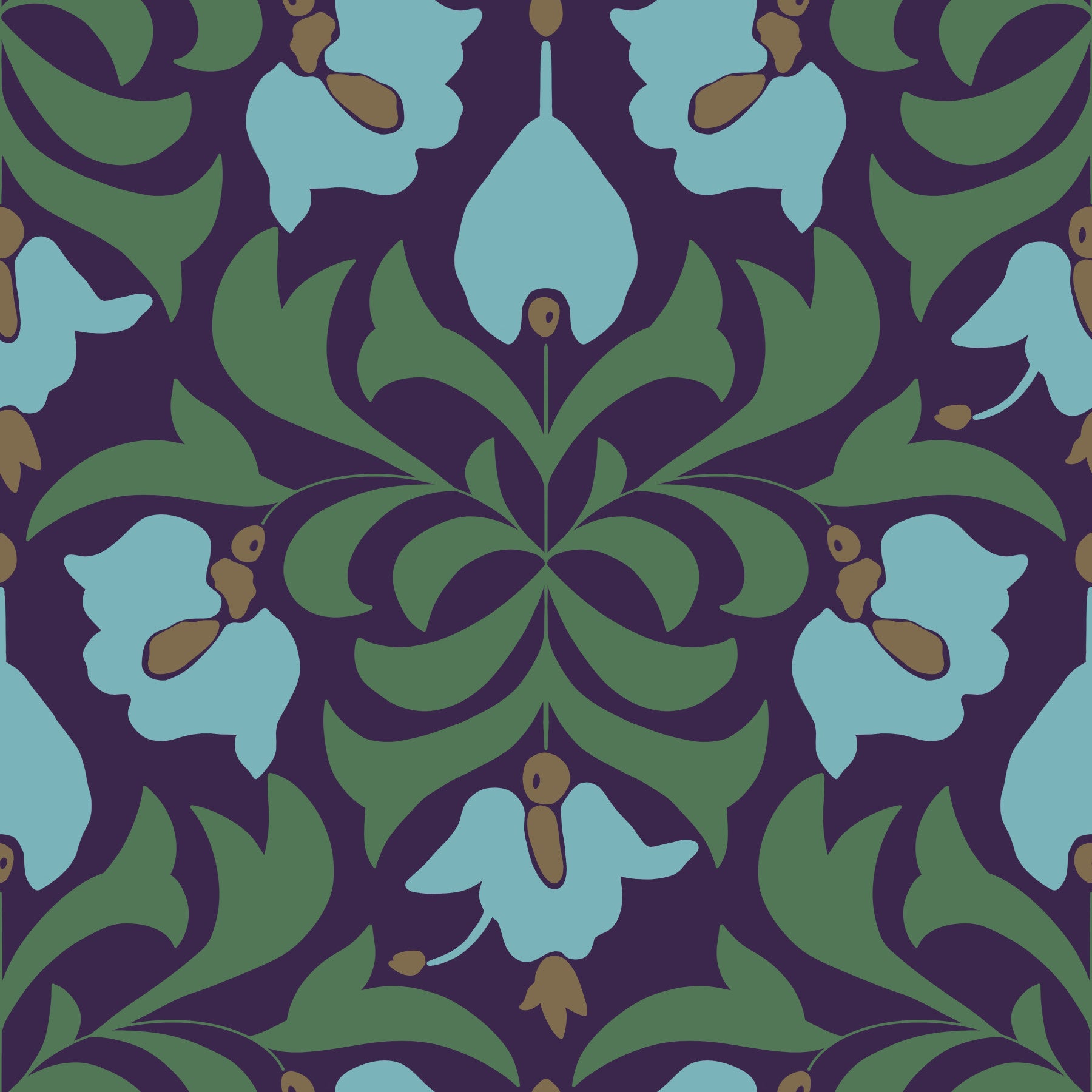 Invite a touch of vintage charm into your home with this art nouveau inspired wallpaper for walls. Light blue blossoms and green leaves create a stylized floral design, set against a deep, rich purple. Perfect for creating a sophisticated atmosphere in any room, from a dining room to a hallway. The repeating pattern complements both modern and classic decor styles. The design offers a timeless elegance with a bold color palette, adding drama and personality.