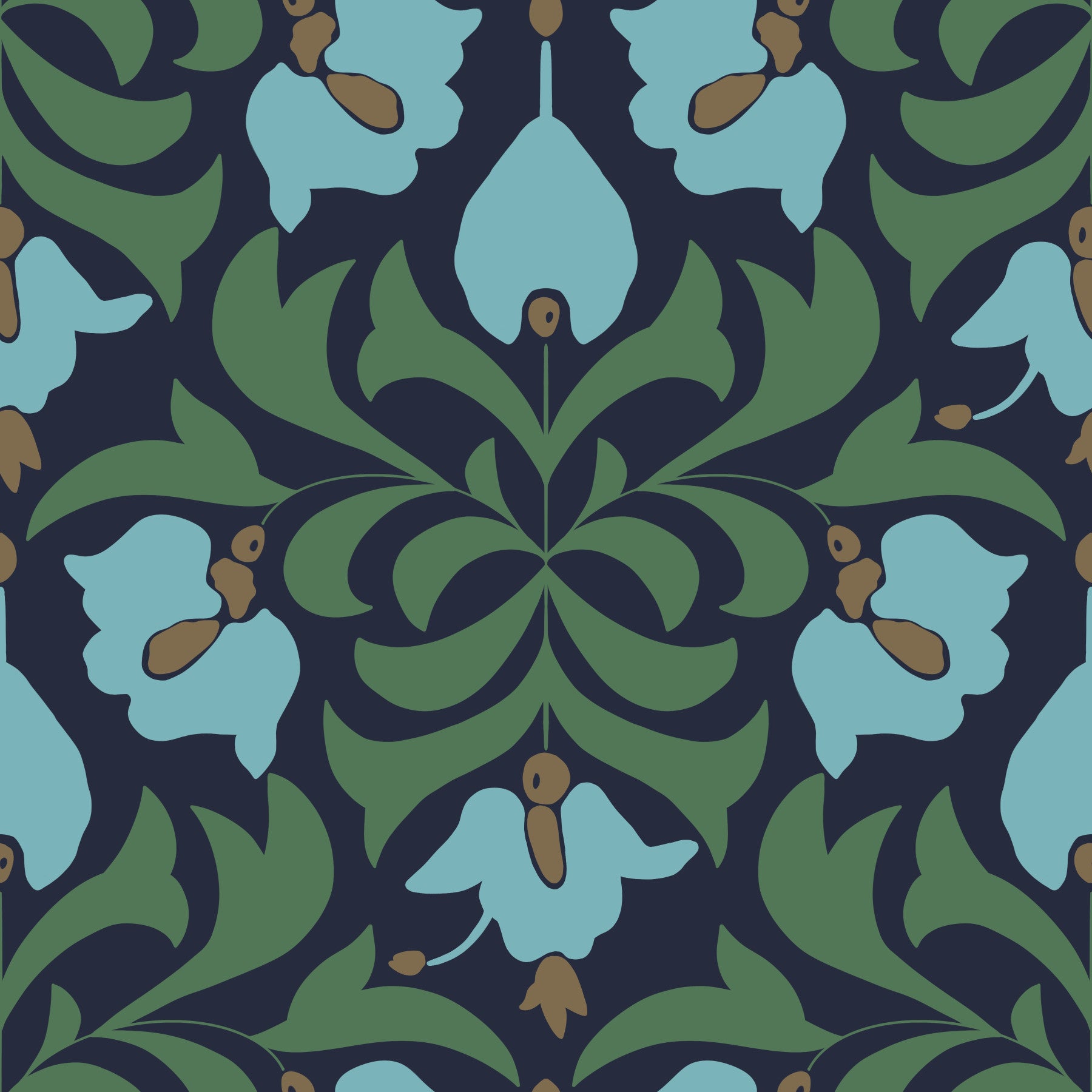 Transform your space with this sophisticated floral design. Against a deep backdrop, teal blooms unfold amidst intricate green leaves, crafting a pattern. Perfect as wallpaper for walls, it infuses richness into any setting. Imagine it gracing the dining room, study, or hallway. Its subdued colors and timeless pattern add a touch of elegance. This decor complements traditional and contemporary spaces, enhancing their visual appeal. The floral design has a flat, artistic appearance. The motif enhances the walls.
