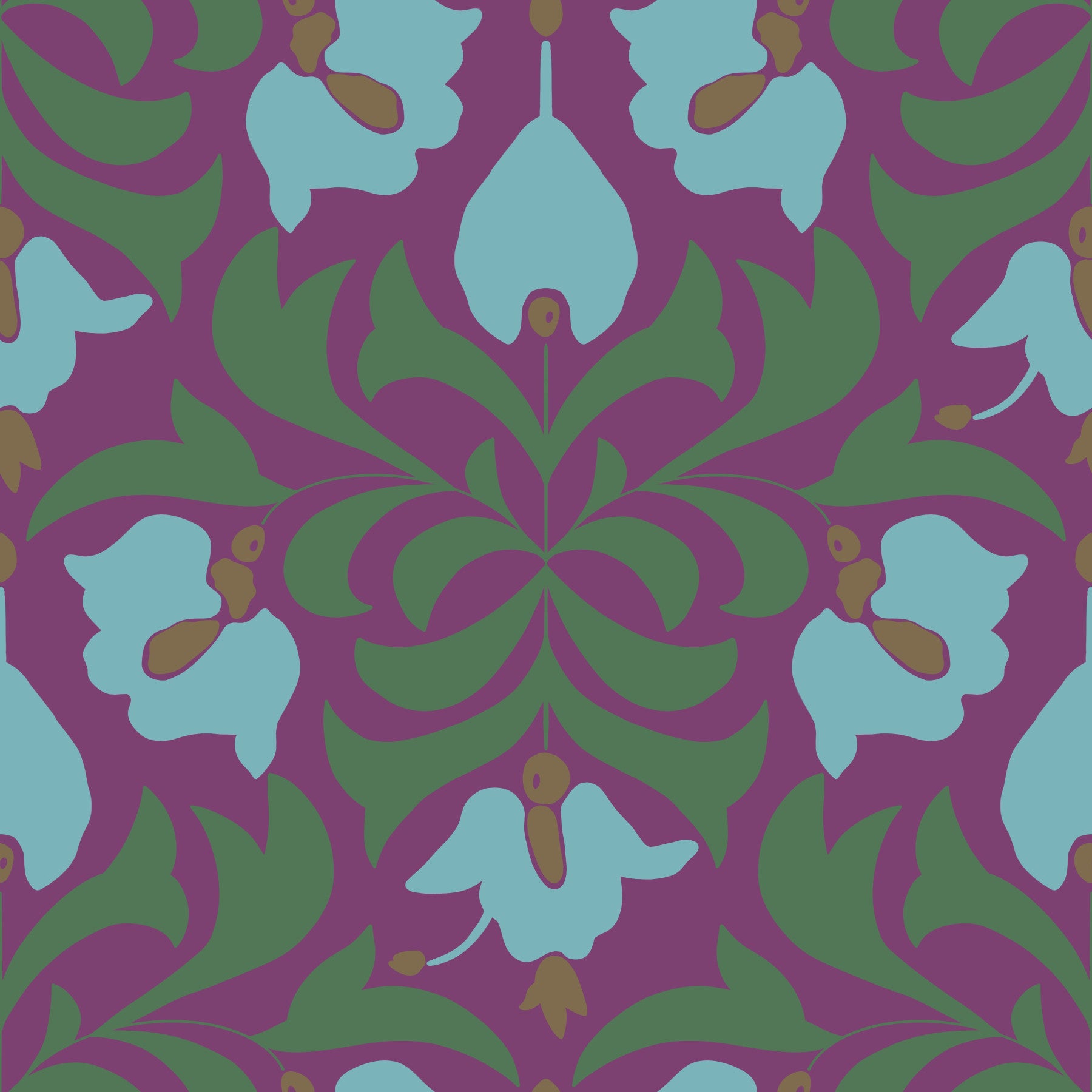 Elevate your home with this vintage-inspired wallpaper. Its bold repeating pattern includes abstract blue flowers and green foliage against a deep purple background. This wallpaper for walls easily becomes a statement piece. It is excellent for adding a touch of elegance to your living room. It suits a bedroom, hallway, or dining room. Its vivid tones and floral charm create a stylish, inviting look that works with a range of decors.