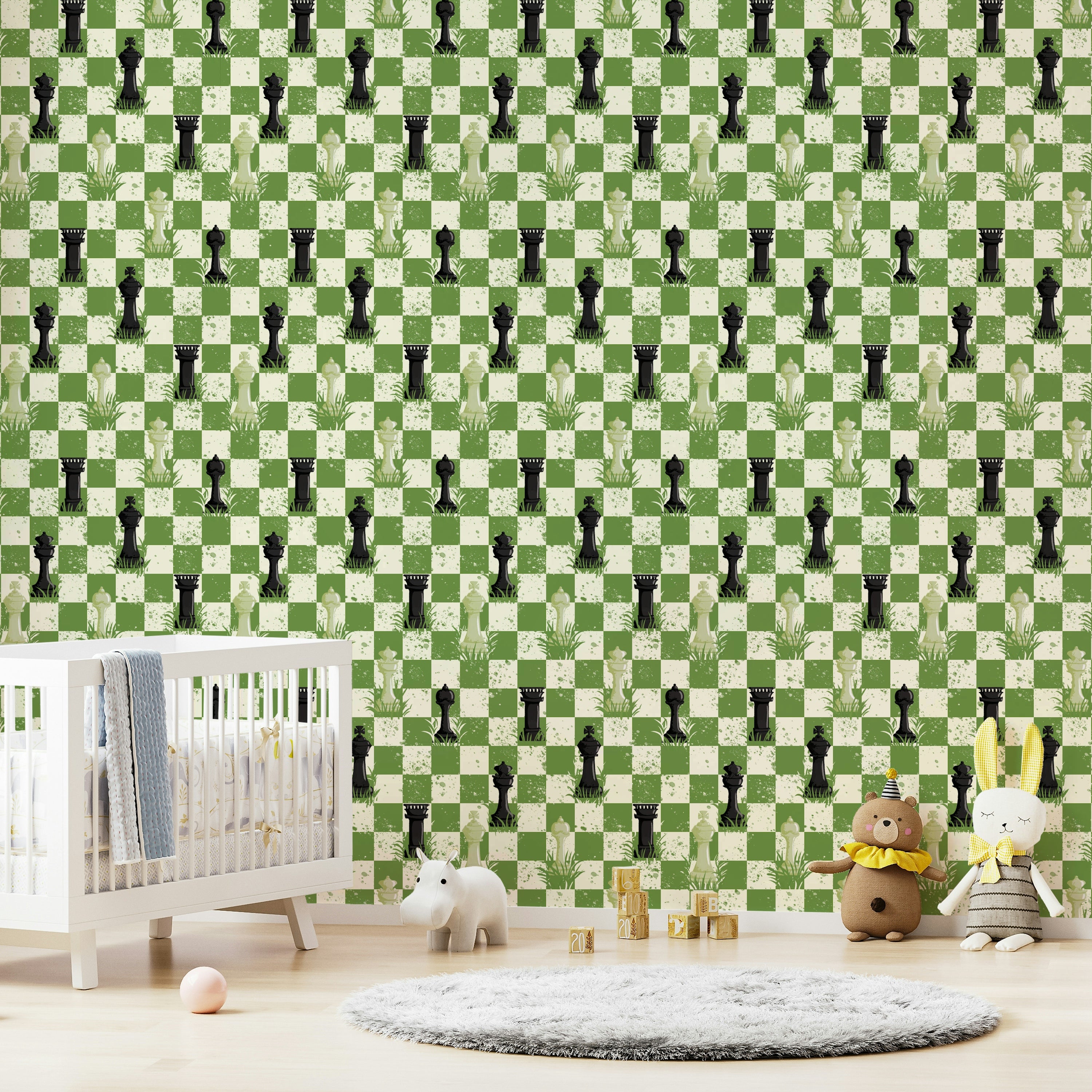 A serene and stylish wallpaper featuring an outdoor chessboard rendered in calming greens and creamy off-whites. Chess pieces, seemingly grown into the lush grass, add a whimsical touch. The distressed, paint-splattered texture lends a unique, artistic feel, evoking a sense of relaxed strategy and a peaceful, natural setting. This design is perfect for those who appreciate a blend of classic strategy and nature's calming embrace. The soft color palette creates a soothing atmosphere ideal for a tranquil workspace or a peaceful living room.