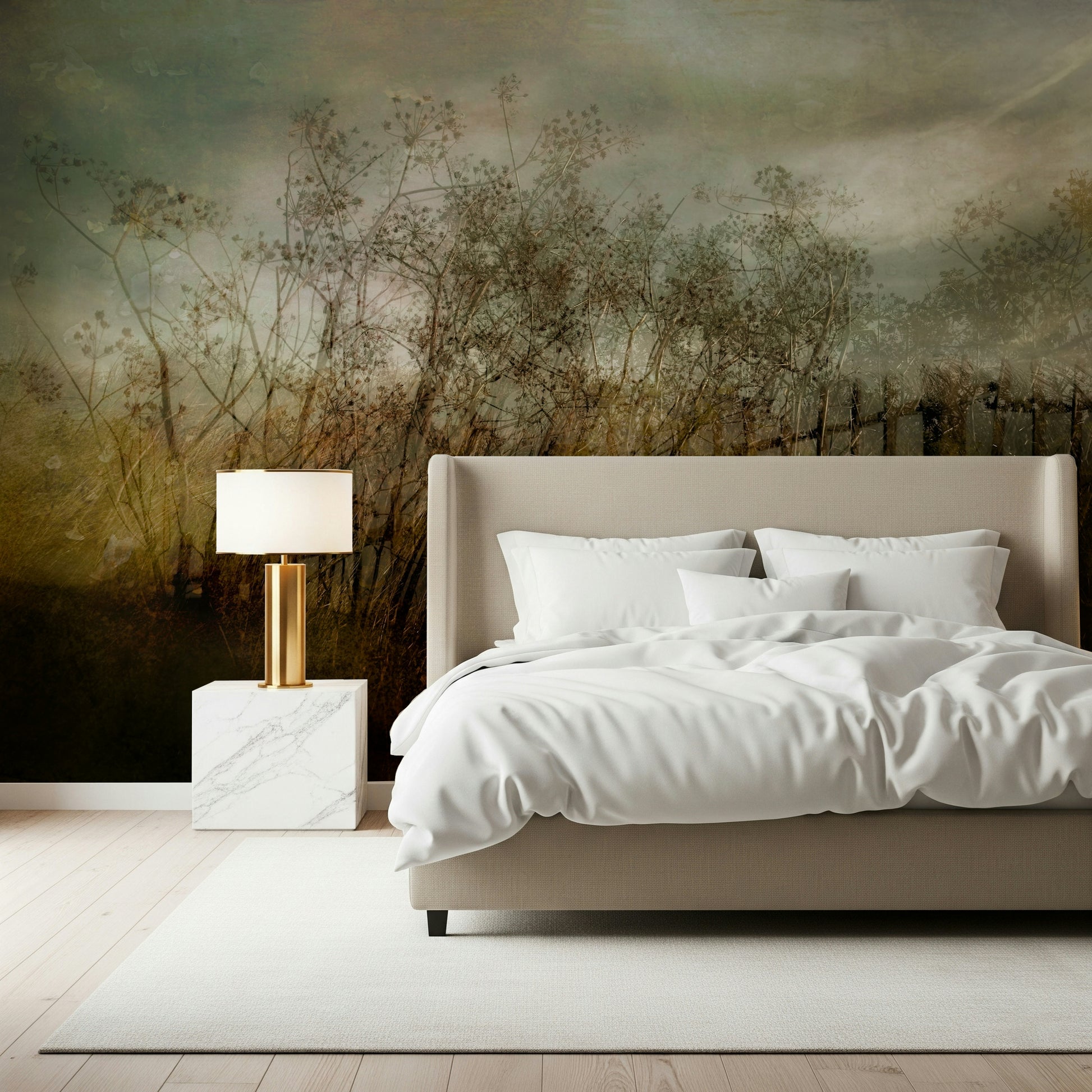 A serene subtle foliage wall mural for moody decor.