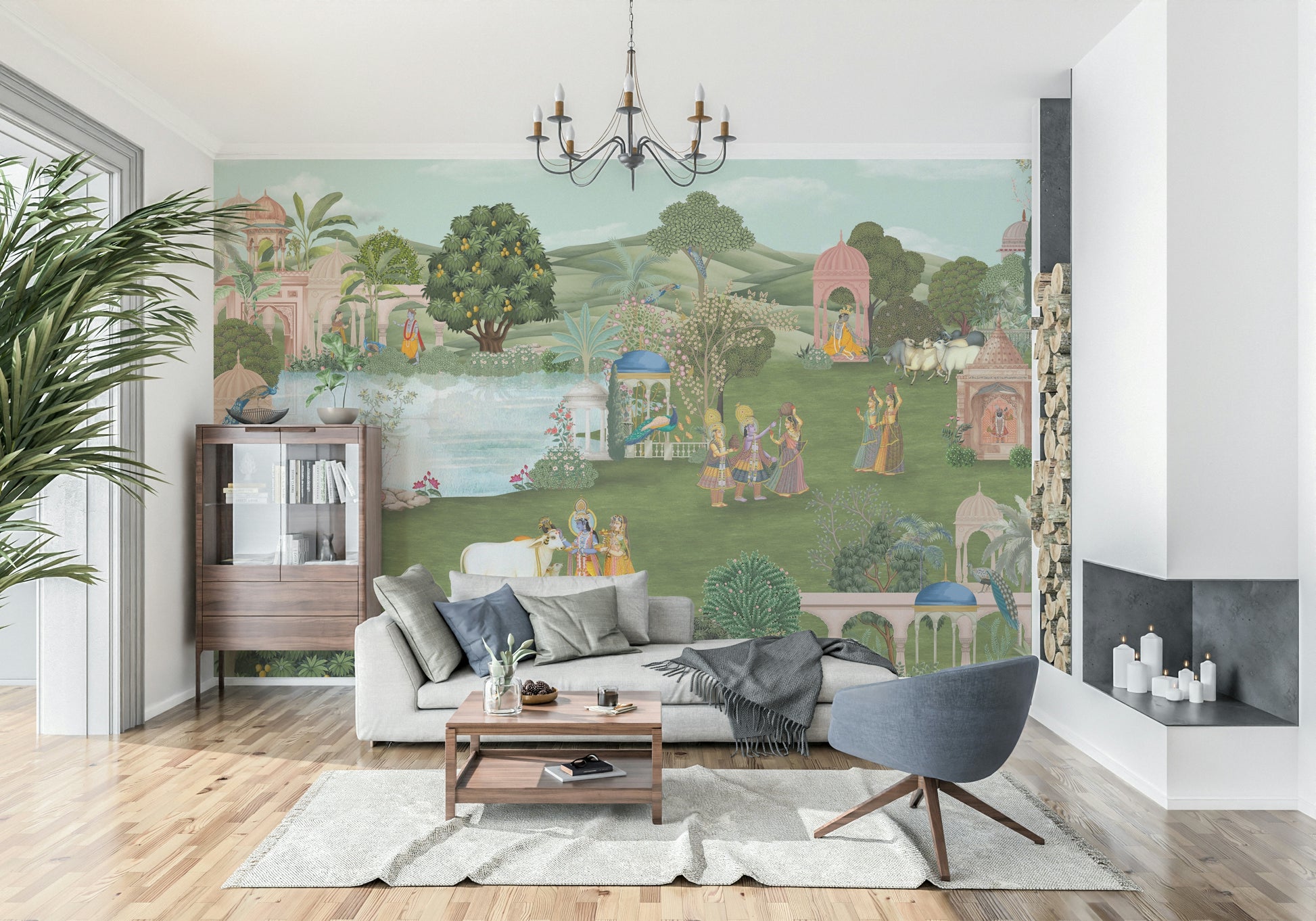 Escape to a tranquil realm with "Pahari Peacocks", where idyllic landscapes meet regal elegance. This captivating design immerses you in a timeless scene inspired by traditional Pahari miniature art. Lush greenery unfolds across rolling hills, dotted with ornate pavilions and serene water features. Majestic peacocks, symbols of beauty and grace, roam freely, adding splashes of vibrant color to the pastel palette. Figures adorned in traditional attire move through the landscape, hinting at stories of devotion and harmony with nature. Rich details abound, from the intricate architecture of the pavilions to the meticulously rendered foliage. "Pahari Peacocks" evokes a sense of calm and wonder, transforming any wall into a window overlooking a peaceful paradise, inviting contemplation and a touch of royal charm into your space.