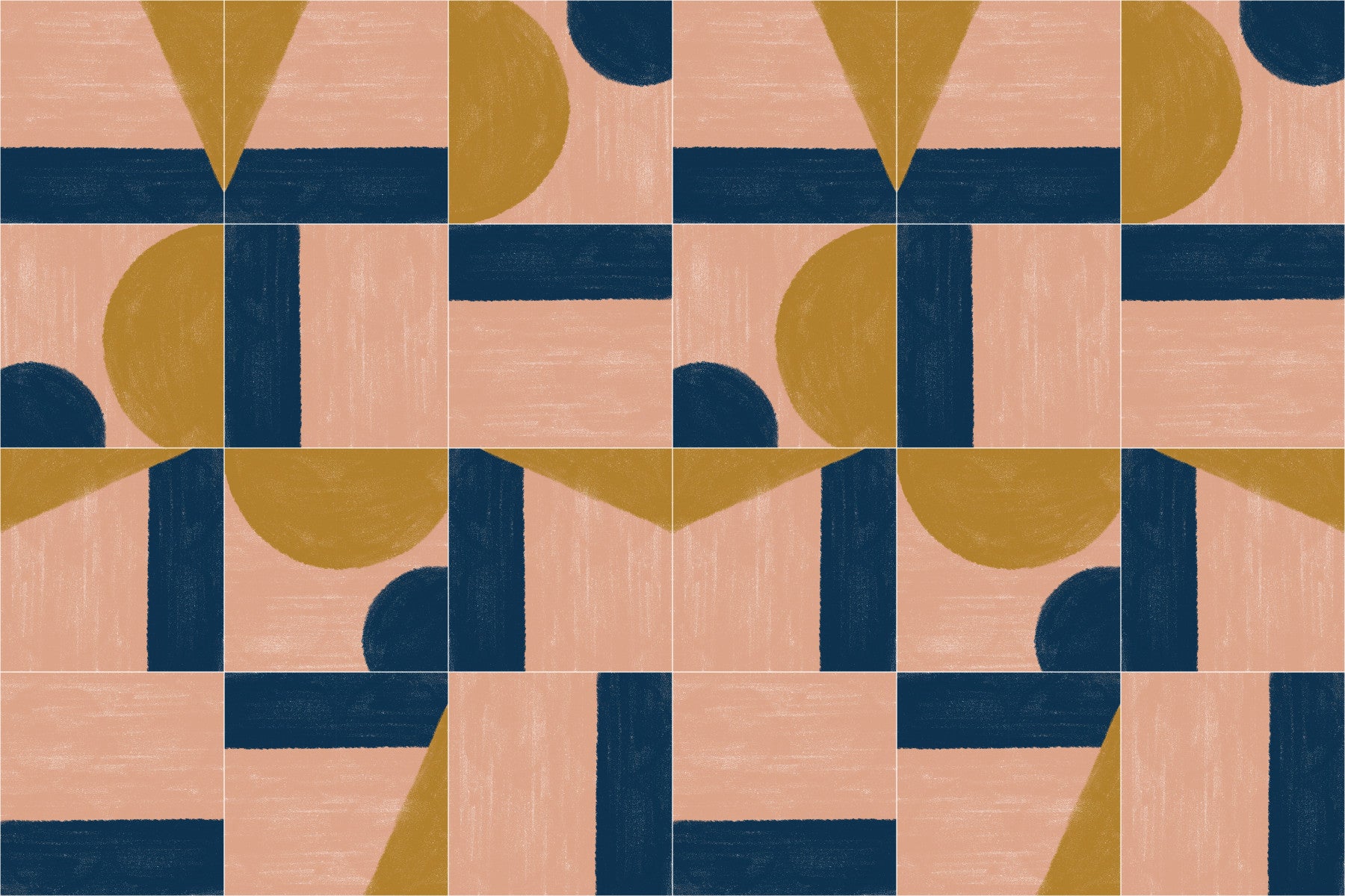 Step into a world of understated elegance with Painted Wall Tiles One. This wallpaper captures the essence of handcrafted art, presenting a series of geometric shapes – circles, triangles, and rectangles – as if lovingly painted onto individual tiles. The color palette, featuring a muted blush, deep navy, and warm mustard, evokes a sense of calm and sophistication. Each shape boasts a subtle, textured finish, mimicking the imperfections of real paint and lending an organic, tactile feel to your digital space. The arrangement of the tiles creates a visually engaging pattern that’s both modern and timeless. "Painted Wall Tiles One" is perfect for adding a touch of artistic flair to any room, be it a cozy study or a minimalist living area. Let this wallpaper transform your screens into a gallery of simple, yet captivating, beauty.