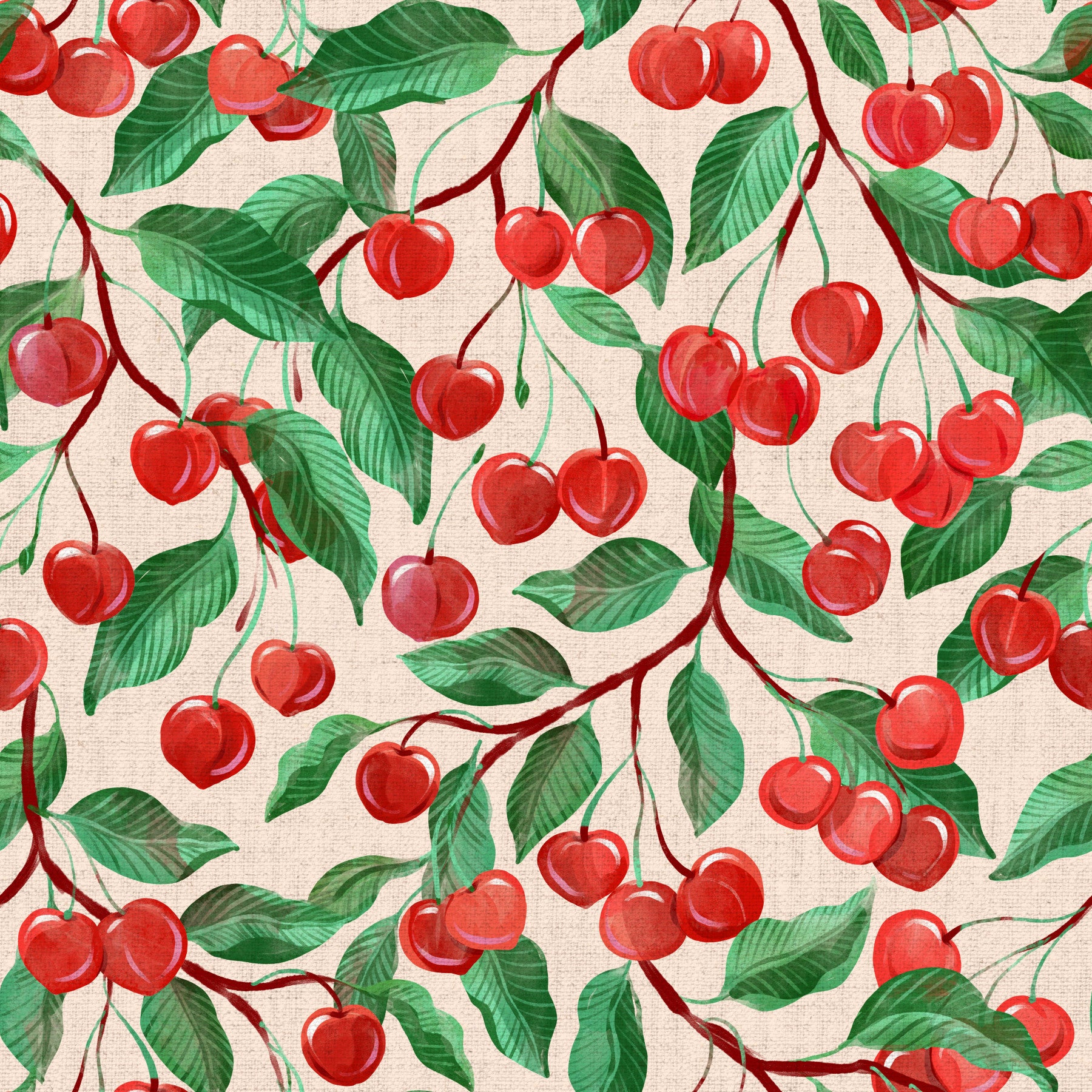 Indulge in the vibrant beauty of 'Painterly Cherries,' a digital wallpaper that captures the essence of summer. Luscious, crimson cherries, rendered in a painterly style with visible brushstrokes, hang from lush, green branches against a soft, beige linen-textured backdrop. The design is both playful and sophisticated, creating a cheerful and inviting atmosphere. The watercolor-like effect adds a touch of whimsy, making this wallpaper perfect for adding a touch of fruity charm to any digital device. Enjoy the delectable visual feast!