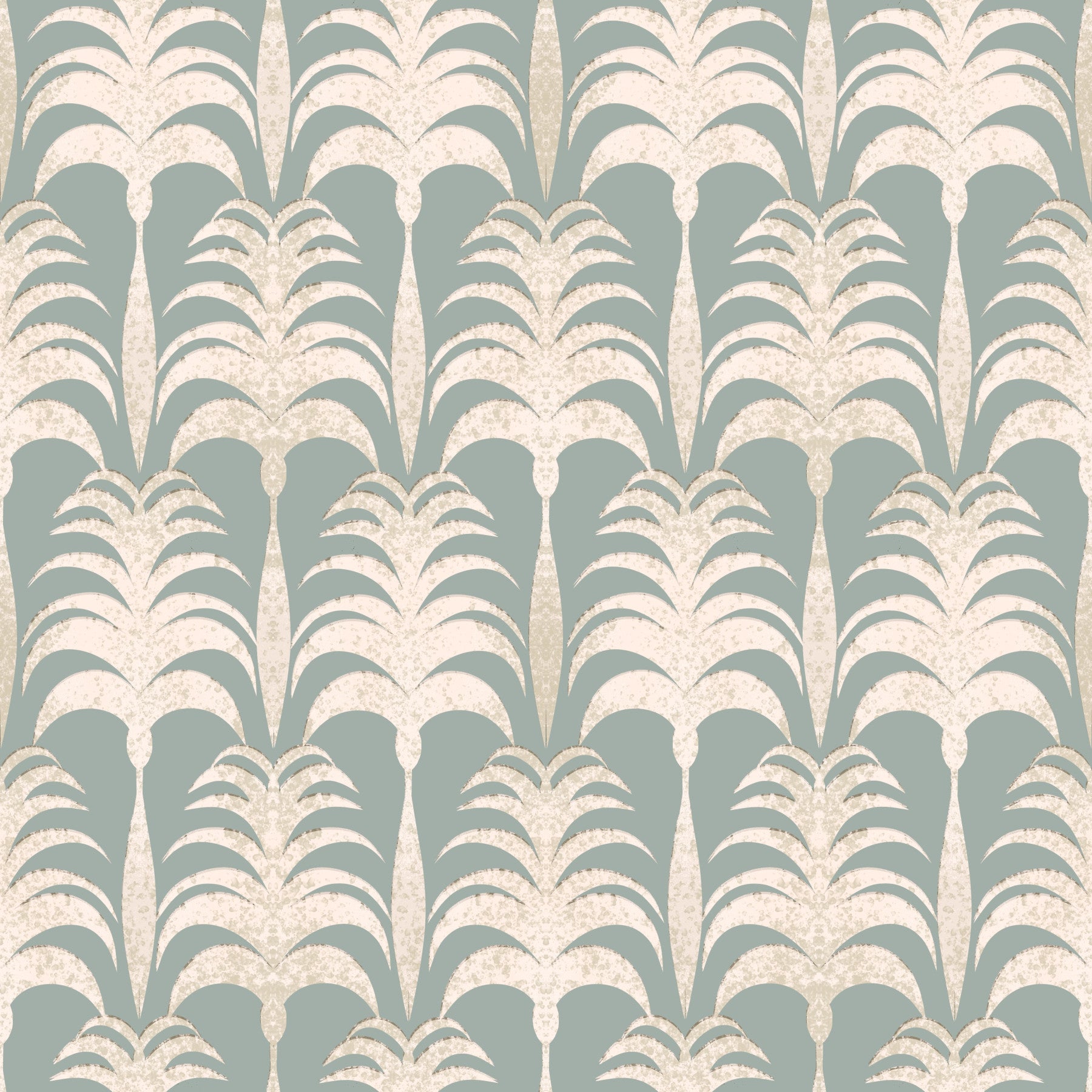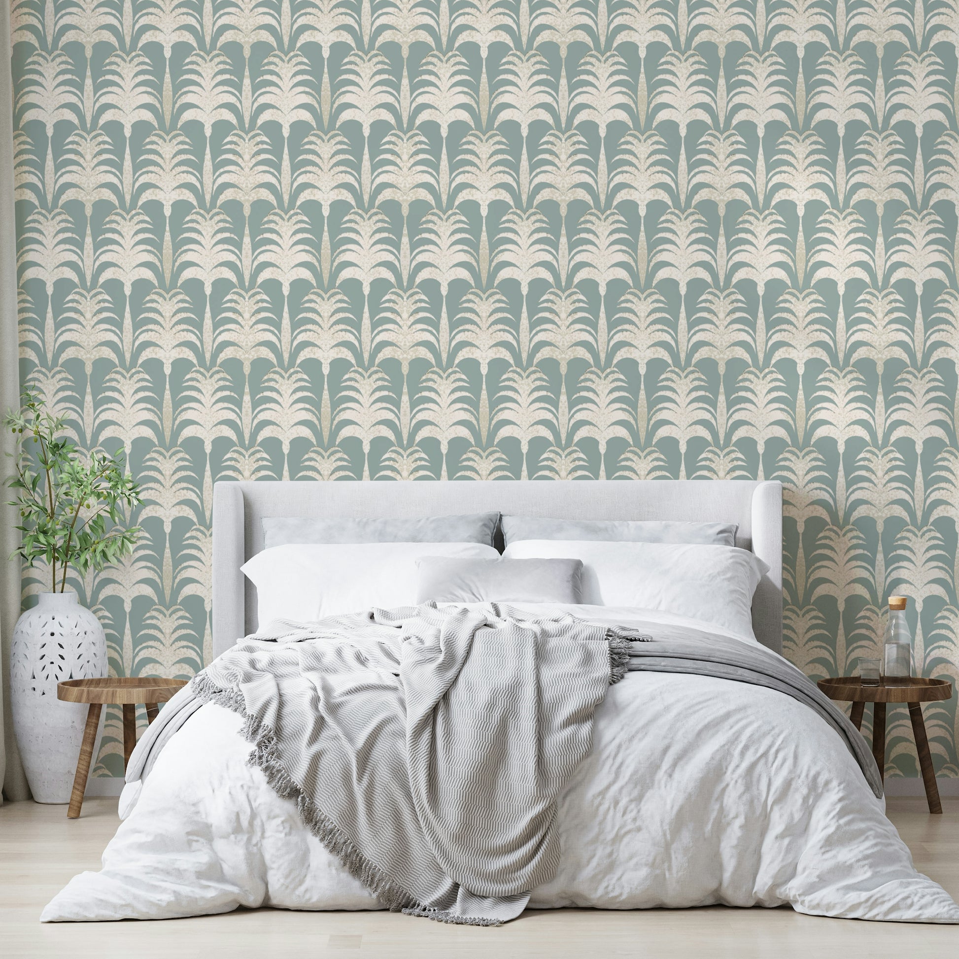 Invite understated tropical elegance with this unique wallpaper for walls. It shows textured palm fronds in a repetitive design set against a muted teal backdrop. The combination creates a sophisticated, relaxed feeling, perfect for enhancing a bedroom, hallway, or study. The design's soft color palette and geometric arrangement make it an excellent choice for Scandinavian, modern, or bohemian interiors. Let this design echo calm and natural elegance throughout your home.