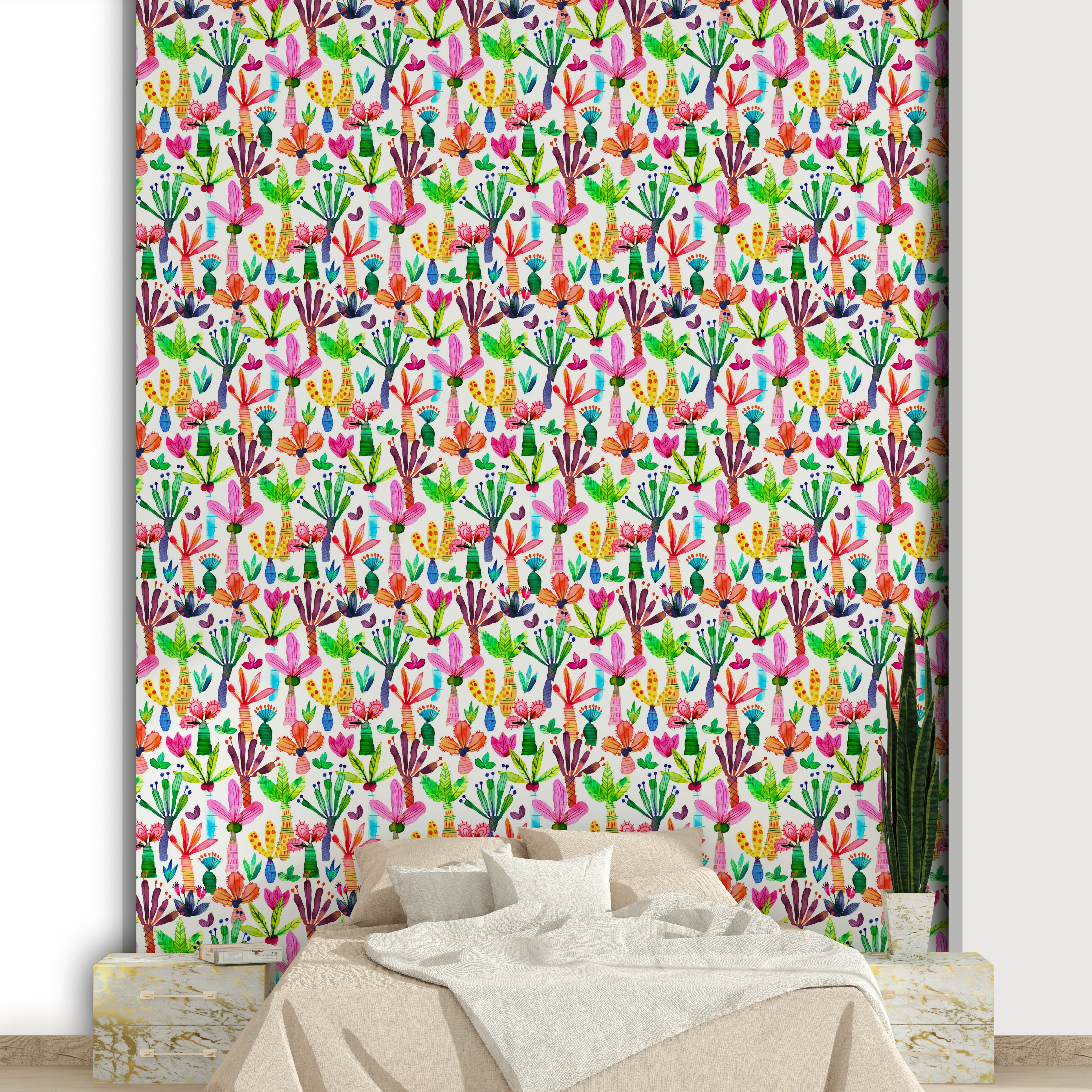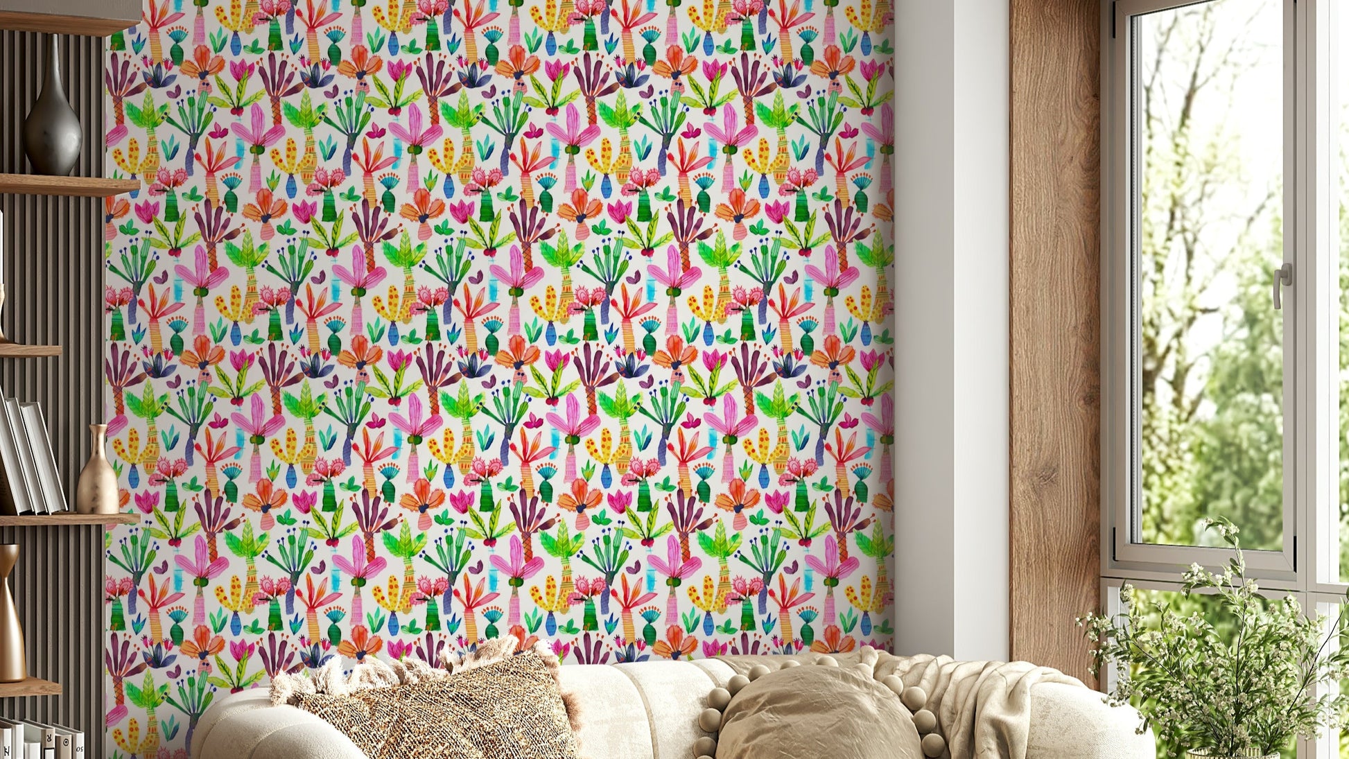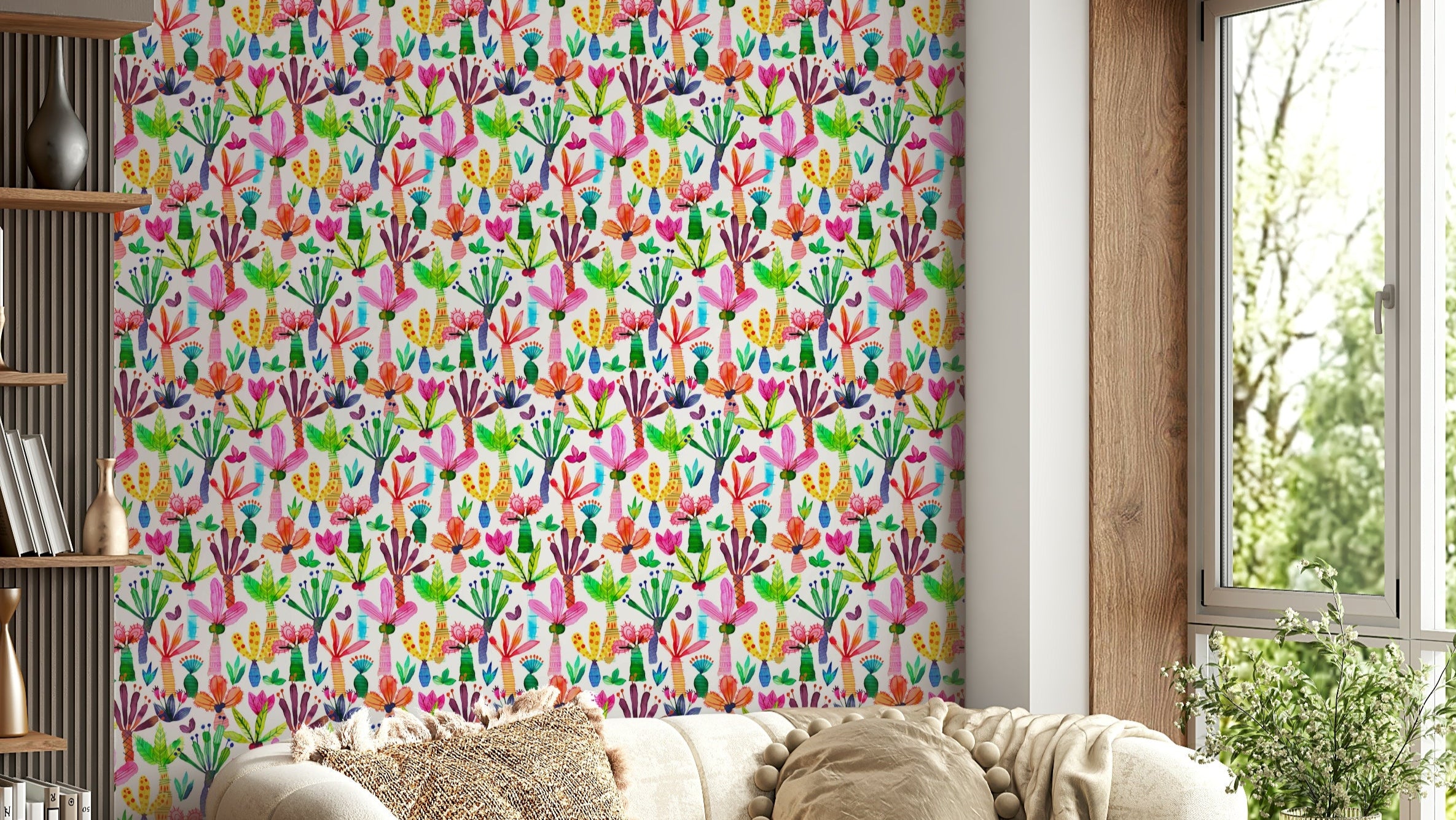 Dive into a vibrant world of playful botanicals with "Palms Garden Colorful Kids." This wallpaper bursts with joy, showcasing a whimsical array of stylized palm trees and flowers in a dazzling spectrum of colors. The hand-painted watercolor style lends a charming, childlike innocence to the design, making it perfect for nurseries, playrooms, or any space needing a boost of cheerful energy. Each element, from the bright, textured trunks to the uniquely shaped blooms, adds to the overall whimsical and energetic mood. A white background allows the colorful flora to truly shine, creating a lively and captivating scene that's both fun and imaginative.