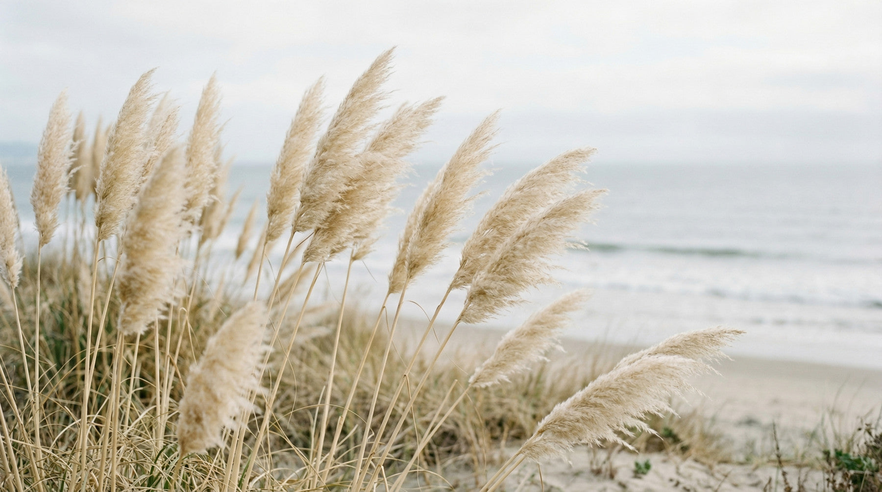 This stunning wallpaper for walls brings tranquil coastal vibes into your home. It features delicate pampas grass swaying gently against a soft, muted seascape. The design captures a serene moment on a sandy dune, perfect for creating a peaceful atmosphere. Its neutral color palette, with warm beige and creamy tones blending into soft grey-blues, offers subtle elegance. This photographic style wallpaper enhances living rooms, bedrooms, or meditation spaces, providing a natural, calming backdrop. It complements minimalist or bohemian interiors beautifully, adding organic texture and a sense of expansive calm without overwhelming the space. Transform your walls into a serene, natural escape.