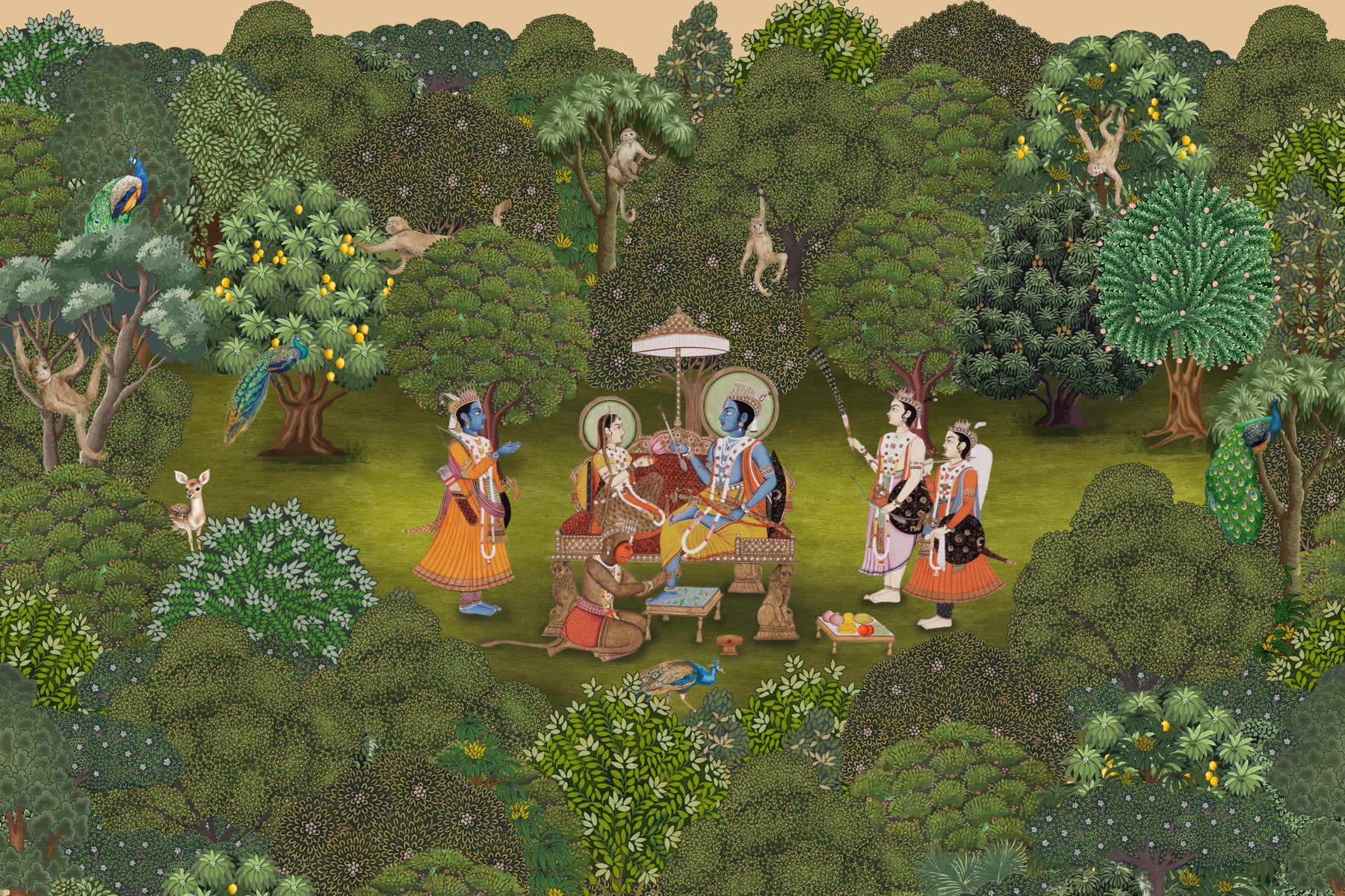 Immerse yourself in the serene beauty of 'Panchavati Vihar', a meticulously crafted wall décor piece inspired by traditional Indian art. This vibrant artwork transports you to a lush, enchanted forest. Ram and Sita, the divine couple, are depicted in peaceful repose amidst a thriving natural world, surrounded by courtiers and attendants. Towering trees filled with vibrant leaves and ripe fruits create a dense, captivating backdrop. Peacocks strut proudly, monkeys playfully swing through the branches, and a gentle deer graces the forest floor. The intricate details and rich color palette bring a touch of timeless elegance and spiritual harmony to any room, transforming your space into a tranquil sanctuary. Let this idyllic scene infuse your home with the essence of tranquility and regal charm.