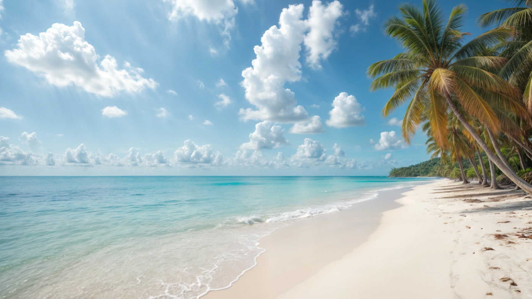 Transform your room into a tropical getaway with this wallpaper. The design shows a serene beach scene, complete with clear waters and gentle waves. Lush palm trees frame the sky, creating a peaceful view. As wallpaper for walls, this image enhances any interior with a sense of calm and natural beauty. Suitable for bedrooms, living rooms, or bathrooms, its soft colors and open composition fit effortlessly into coastal, minimalist, or modern design schemes.