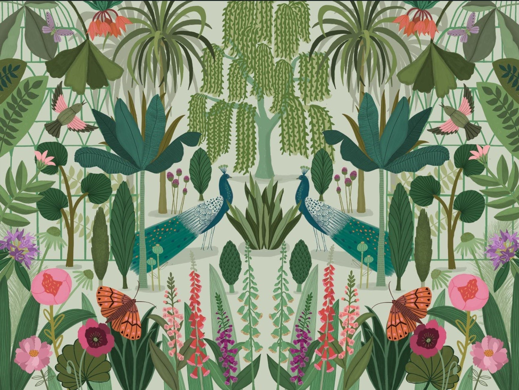 Escape to a serene Parisian park with this enchanting wallpaper. Two majestic peacocks stand proudly amidst a vibrant tapestry of lush tropical foliage, delicate flowers, and fluttering butterflies and hummingbirds. The artwork evokes a sense of tranquility and beauty, capturing the essence of a hidden, meticulously curated garden. Soft greens and muted pinks create a calming atmosphere, while the detailed botanical illustrations showcase the richness of Parisian flora. This design is perfect for adding a touch of sophisticated nature to any space.