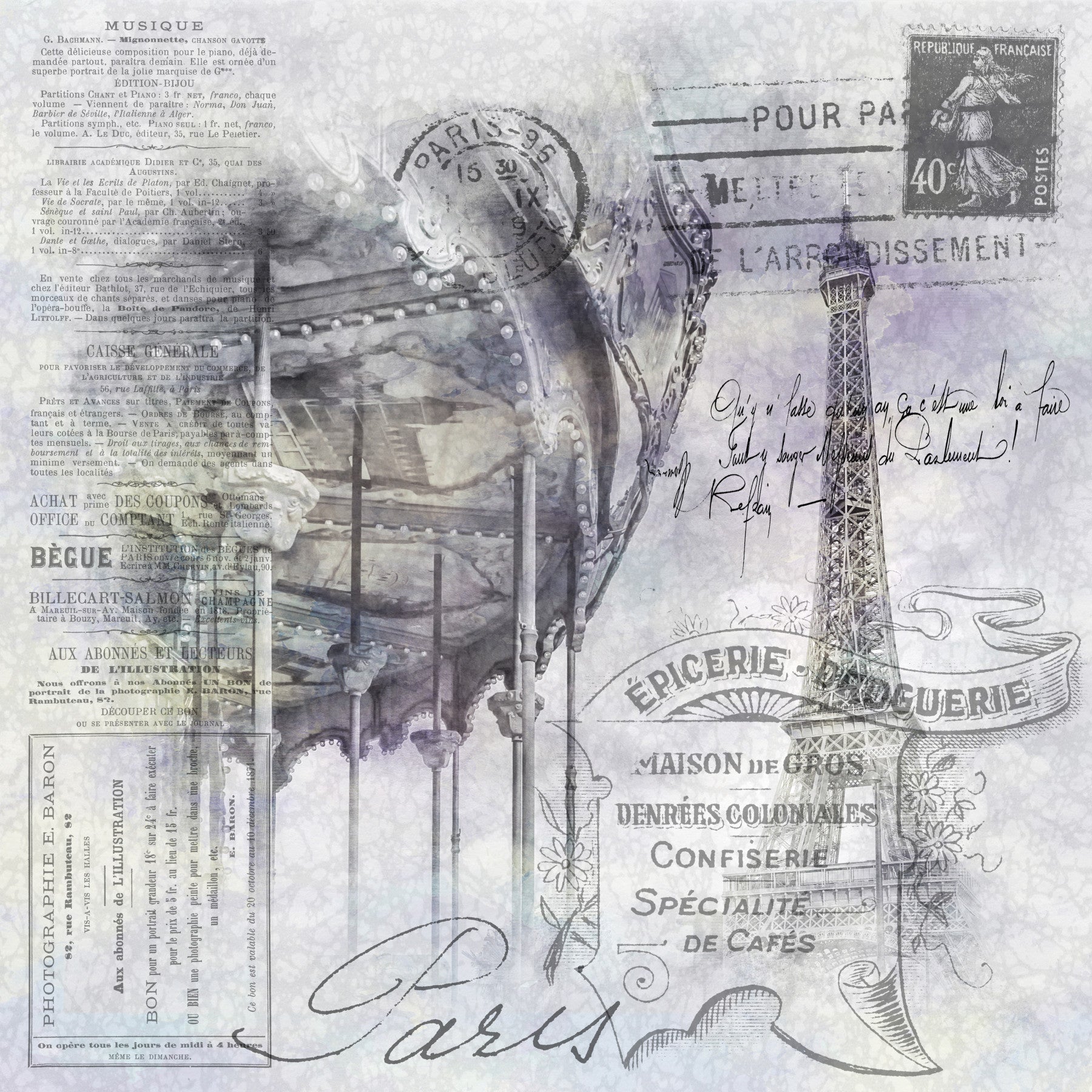 Monochrome mural with Eiffel Tower and carousel in artistic overlay.