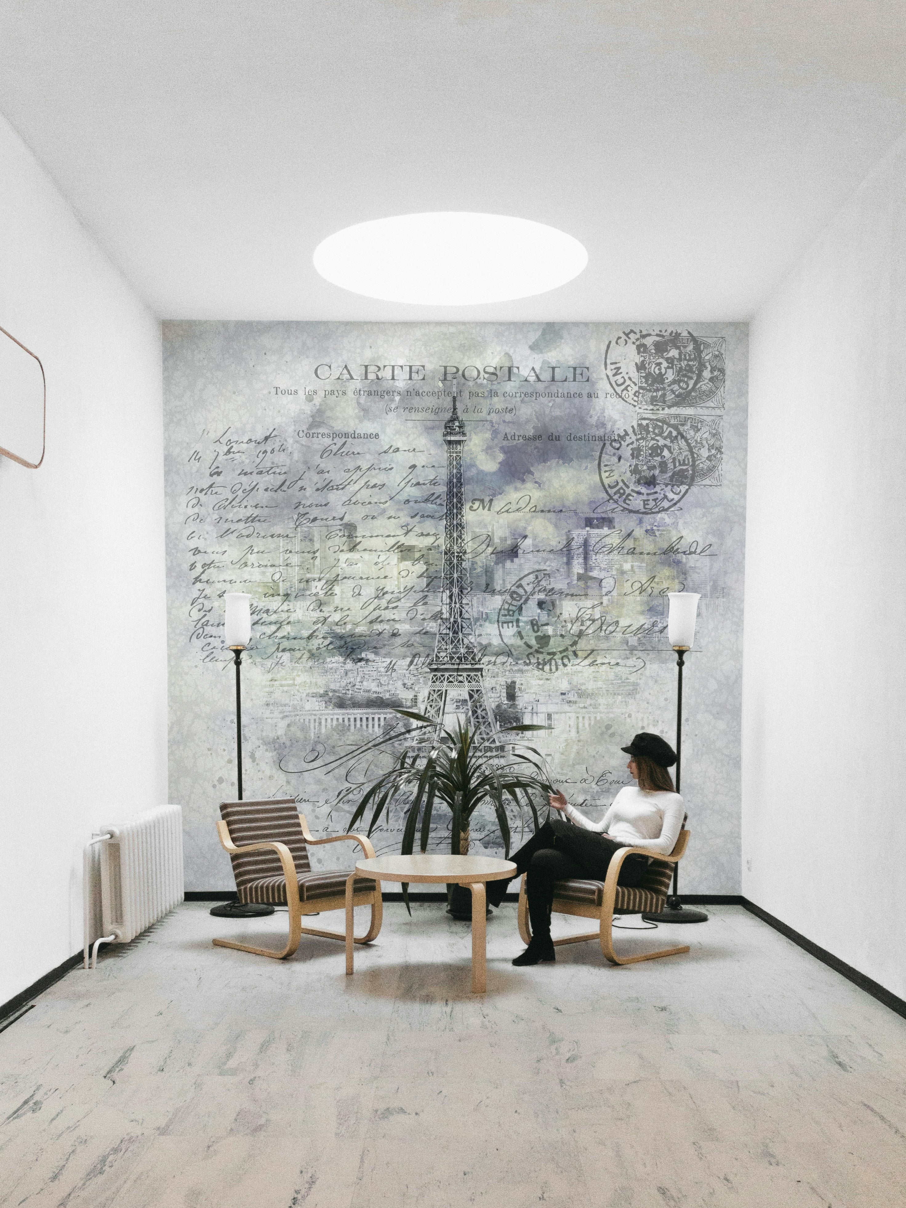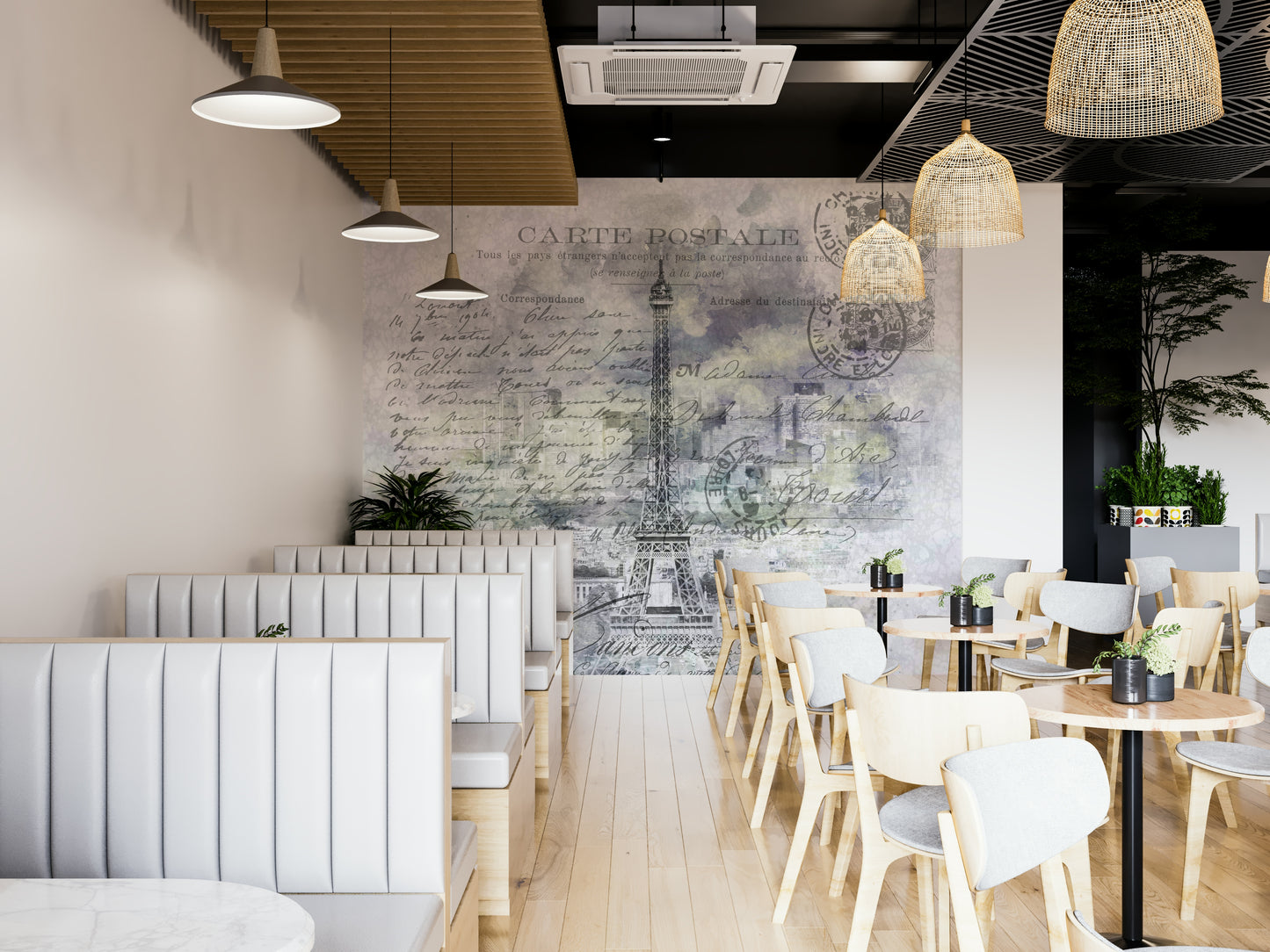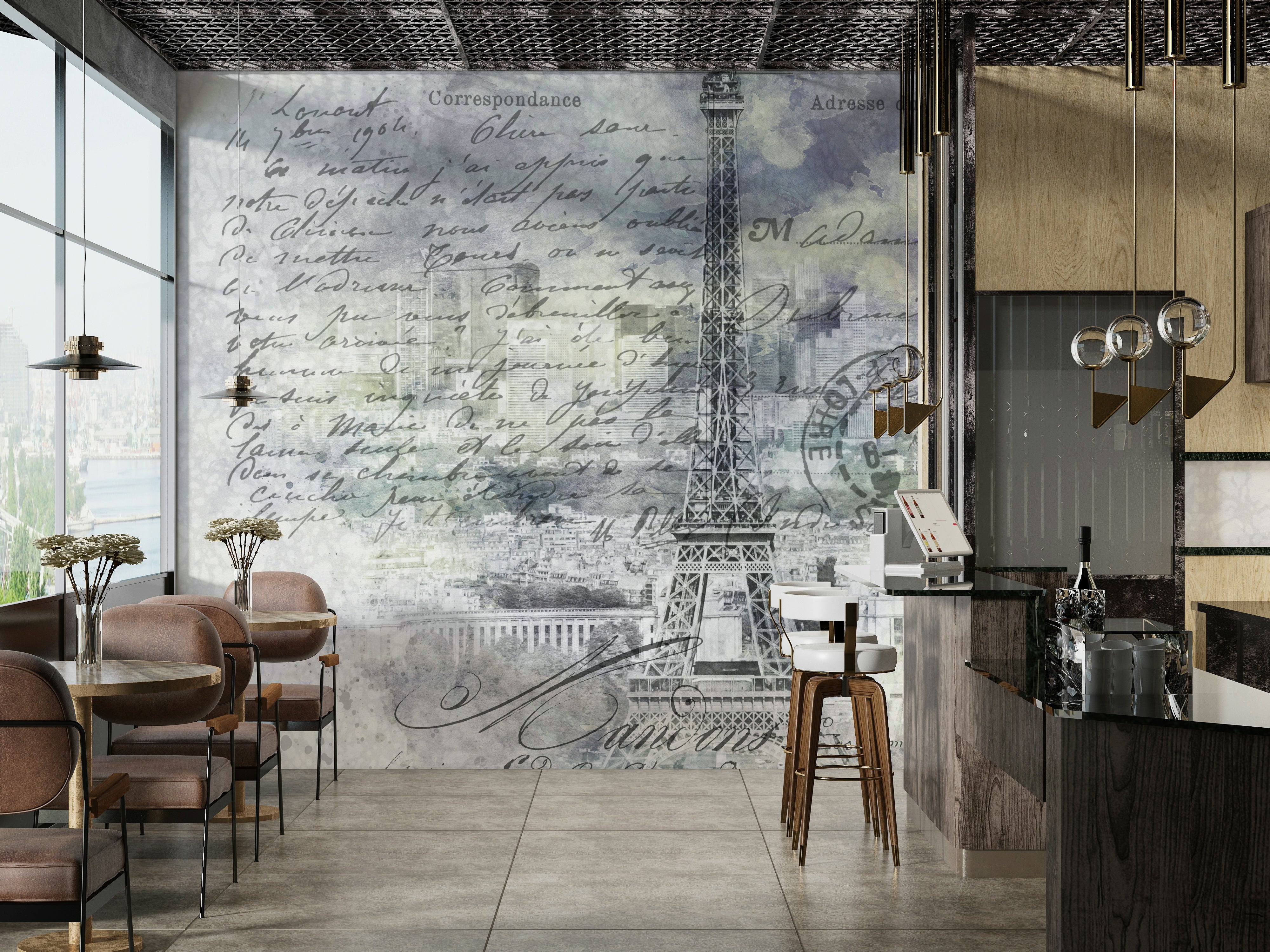 Eiffel Tower and urban skyline mural with a graphic twist.