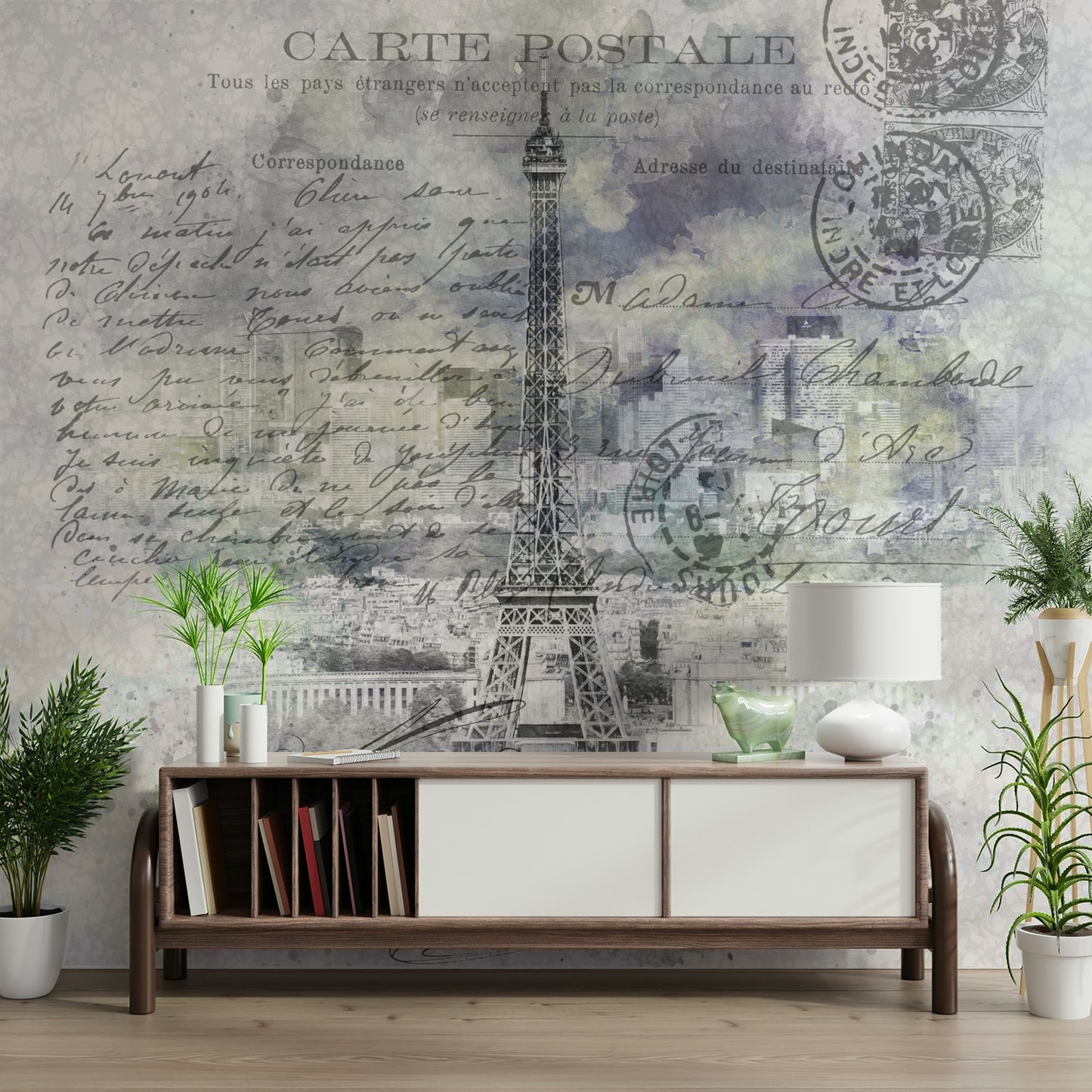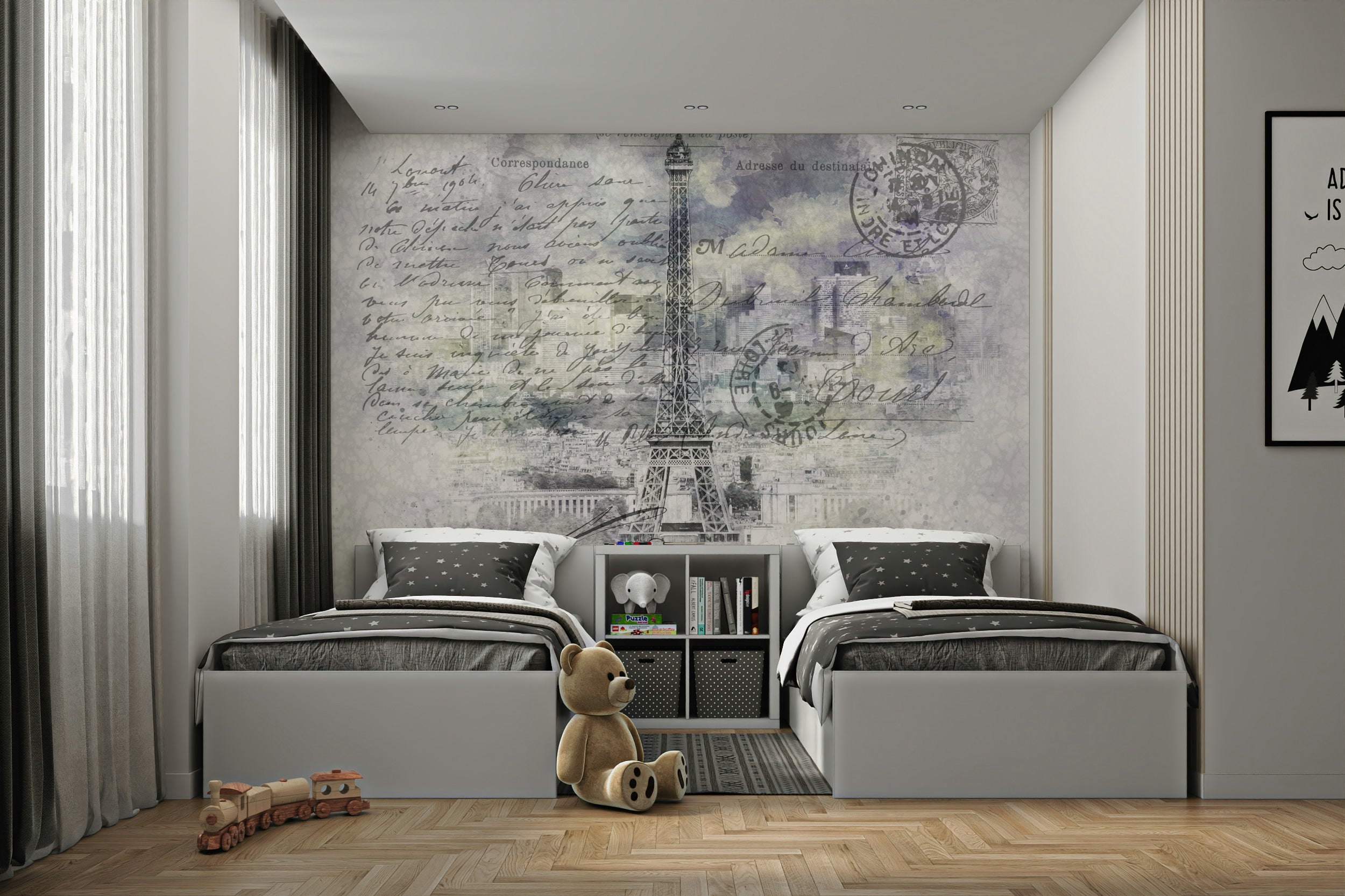 Paris skyline mural with rooftops and Eiffel Tower in view.