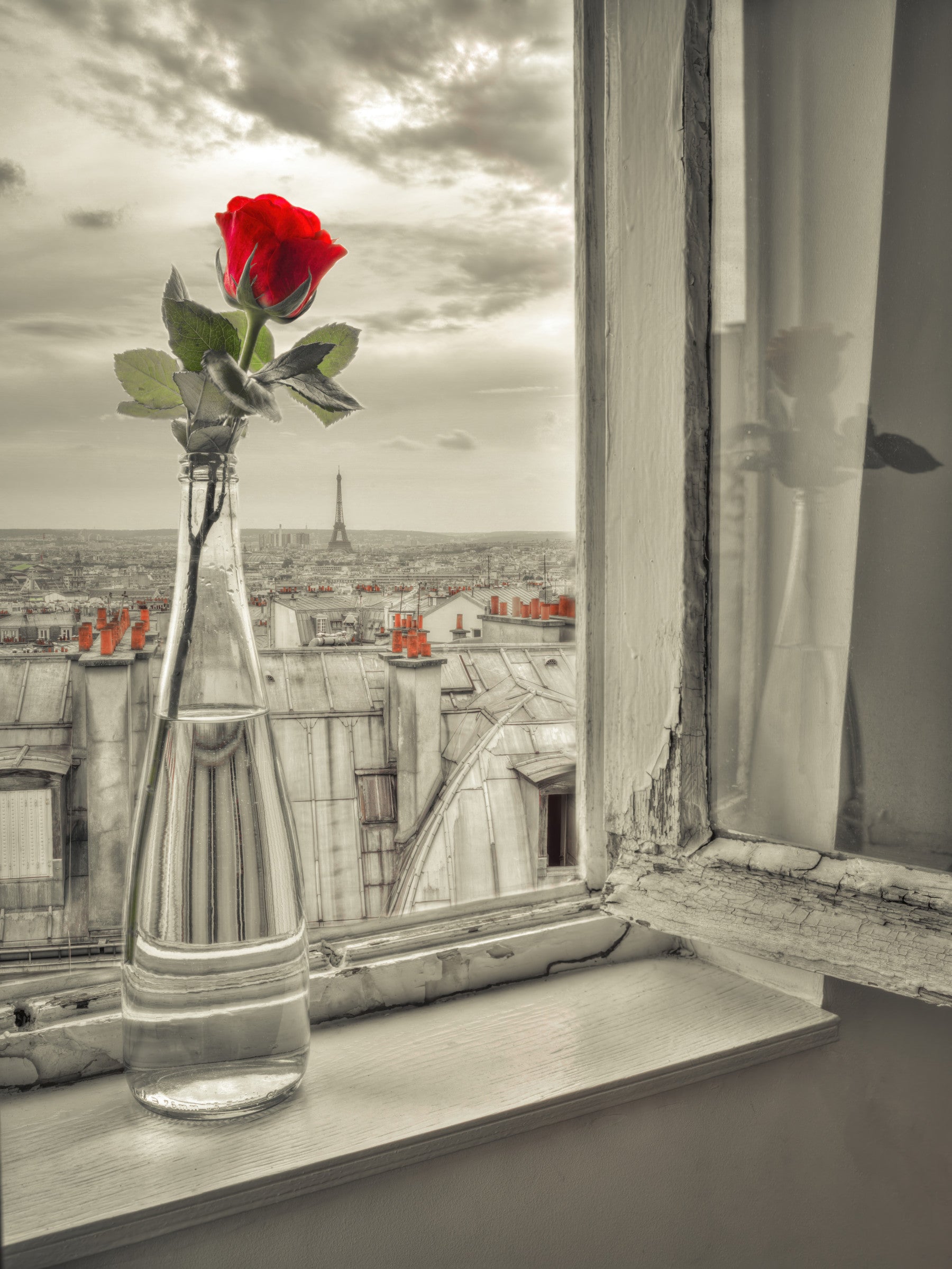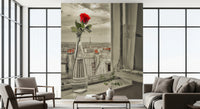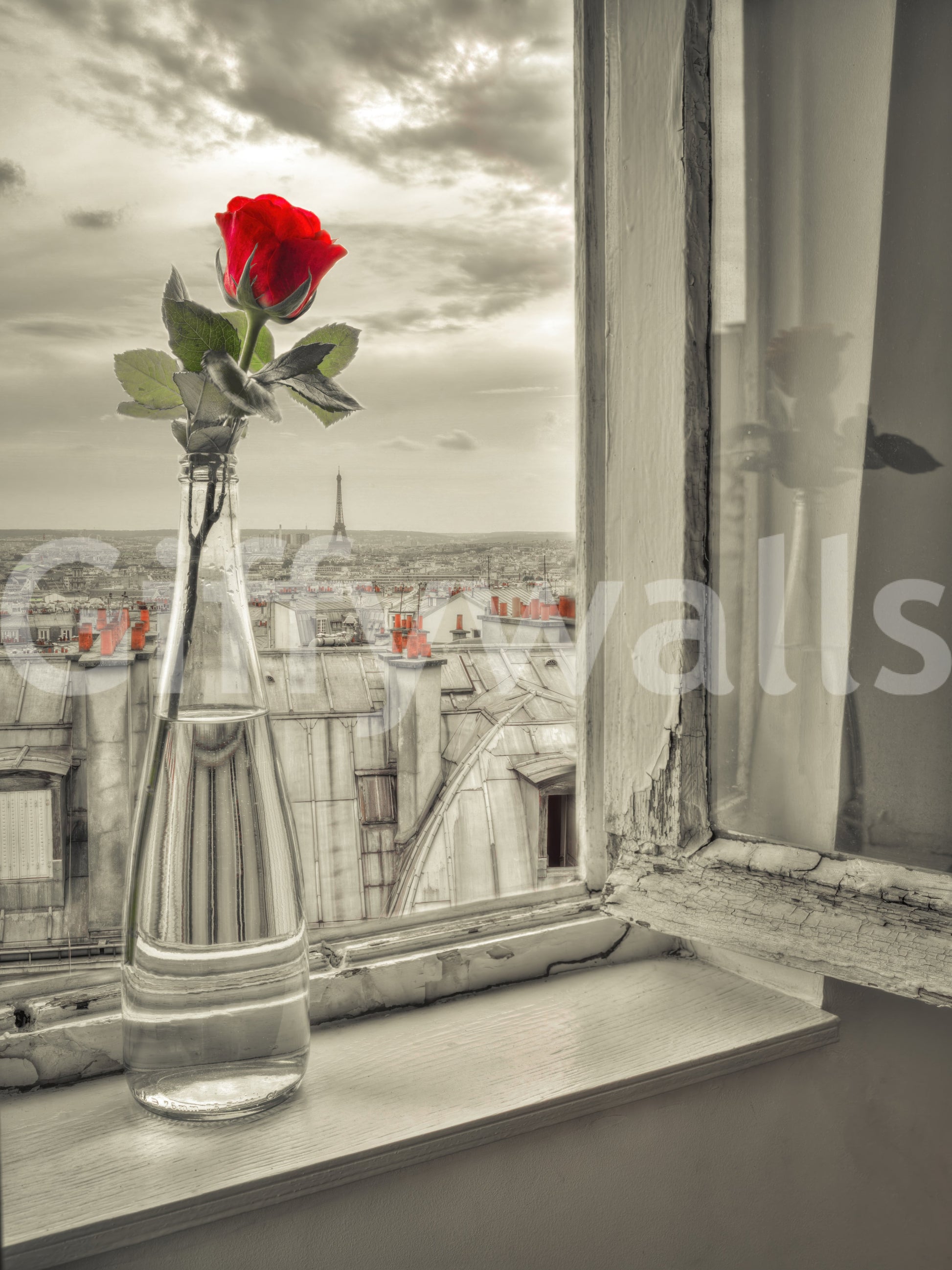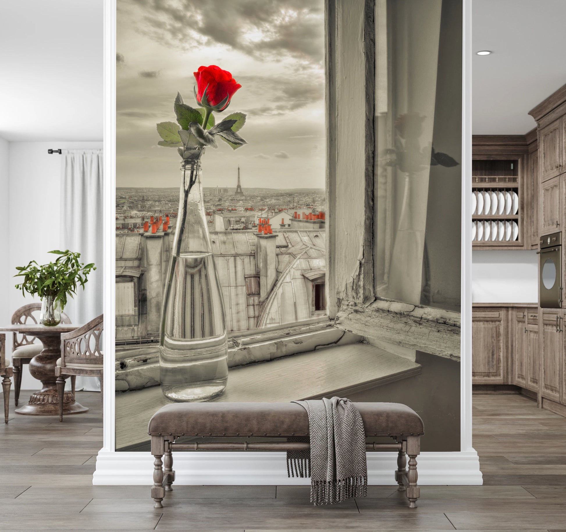 Infuse your interior spaces with a touch of Parisian charm using this unique wallpaper for walls. A vibrant red rose in a simple glass bottle sits on a weathered windowsill, framed by a cityscape featuring the Eiffel Tower. The grayscale palette accentuates the pop of color from the rose, creating an eye-catching focal point. This design adds a romantic, vintage feel to living rooms, bedrooms, or hallways. Imagine the sophistication this wallpaper brings to a quaint dining area or a chic home office, effortlessly blending nature and urban elegance.
