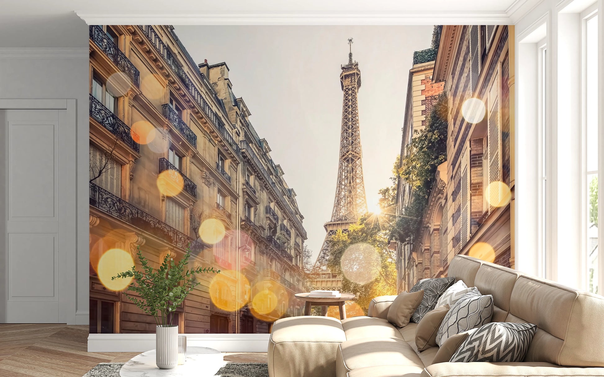 Transform your space with the allure of Paris. This wallpaper for walls brings the iconic Eiffel Tower into your home, framed by elegant architecture. The warm, inviting color palette of soft browns and beiges, accented by sunlit bokeh, creates an atmosphere of sophisticated charm. This design works beautifully in living rooms, bedrooms, or hallways, adding a touch of Parisian elegance to any interior. It enhances spaces by creating a focal point that is both classic and subtly glamorous, making it a striking choice for modern or traditional homes.