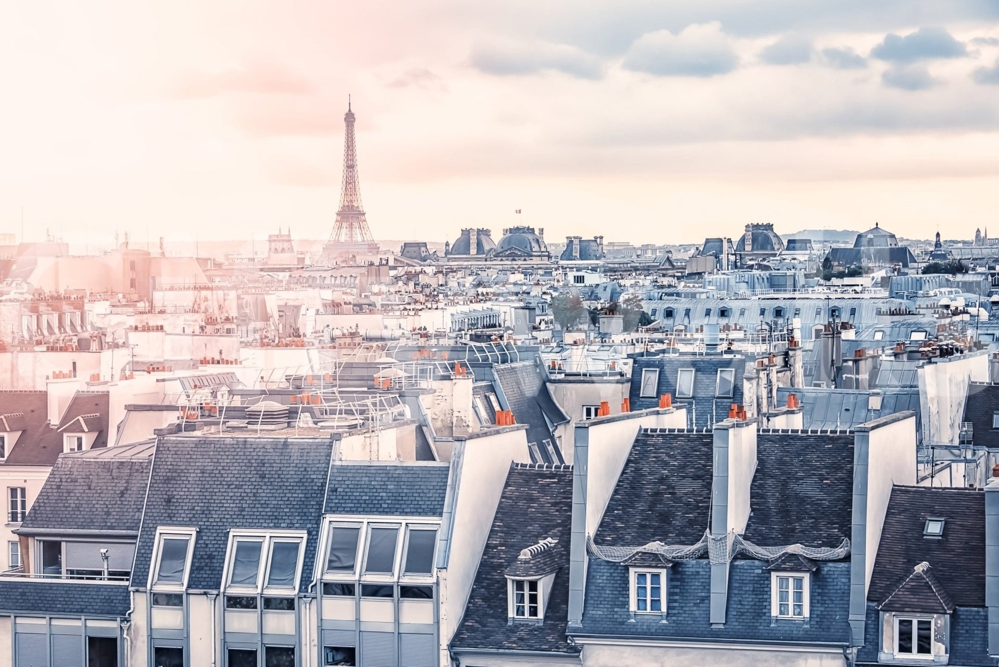 Capture the romance of Paris with this stunning wallpaper for walls. The design showcases a panoramic view of the city rooftops, crowned by the iconic Eiffel Tower. Soft pink and blue hues create a dreamy atmosphere, perfect for bedrooms, living rooms, or home offices. The subtle color palette and detailed architecture bring a touch of sophistication. This wallpaper complements interiors with a blend of urban charm and serene beauty, transforming your space into a Parisian escape. It makes a statement without overwhelming the room.