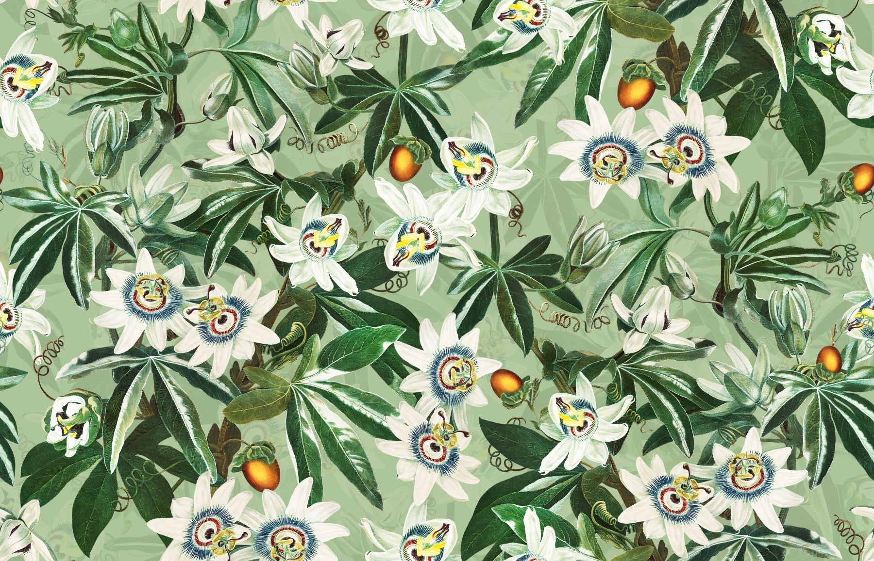 Immerse yourself in a lush botanical haven with this captivating wallpaper. Intricate, hand-drawn passionflowers in exquisite detail bloom across a serene sage green backdrop. The vibrant blues, whites, and greens create a tranquil yet luxurious atmosphere, perfect for adding a touch of exotic elegance to any room. The seamless pattern ensures a cohesive and visually stunning design, transporting you to a vibrant, tropical garden.