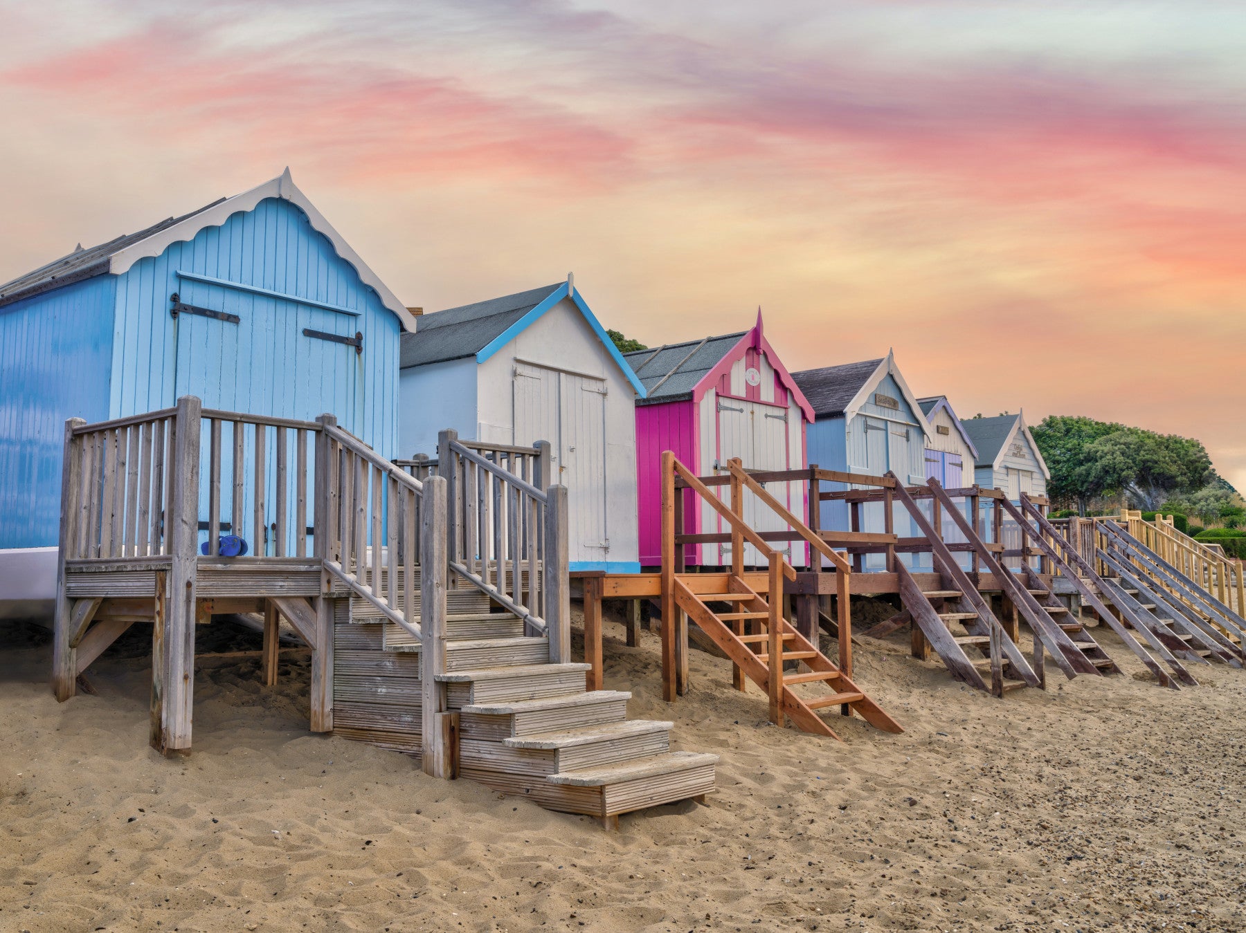Beach huts at dusk, Suffolk. Add a touch of seaside serenity to your home. This wallpaper for walls showcases a row of colorful beach huts. The pastel palette includes blues, pinks, and whites. Natural wood stairs complete the cozy scene. The image evokes a sense of tranquility. The gradient sky offers a serene backdrop. Perfect for bedrooms, bathrooms, or entryways, the scene establishes a peaceful mood. These huts inspire relaxation. The design complements interiors with a coastal aesthetic. It will instantly transport you.