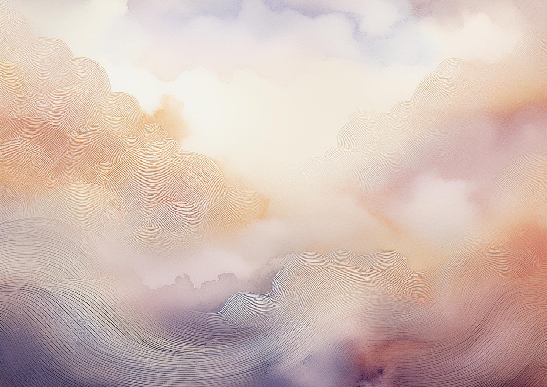 Experience the calming allure of 'Pastel Cloud Dreamscape,' a wallpaper design that blends the soft fluidity of watercolor with the intricate detail of hand-drawn linework. The artwork depicts a serene seascape or cloudscape, with undulating lines creating a sense of gentle movement and tranquility. The color palette is a harmonious blend of warm peach and rose tones, contrasted by cooler lavender and grey shades, all merging beautifully in a misty, watercolor wash. The overall effect is a subtle yet captivating design that evokes feelings of peace and serenity, perfect for creating a soothing atmosphere in any room.
