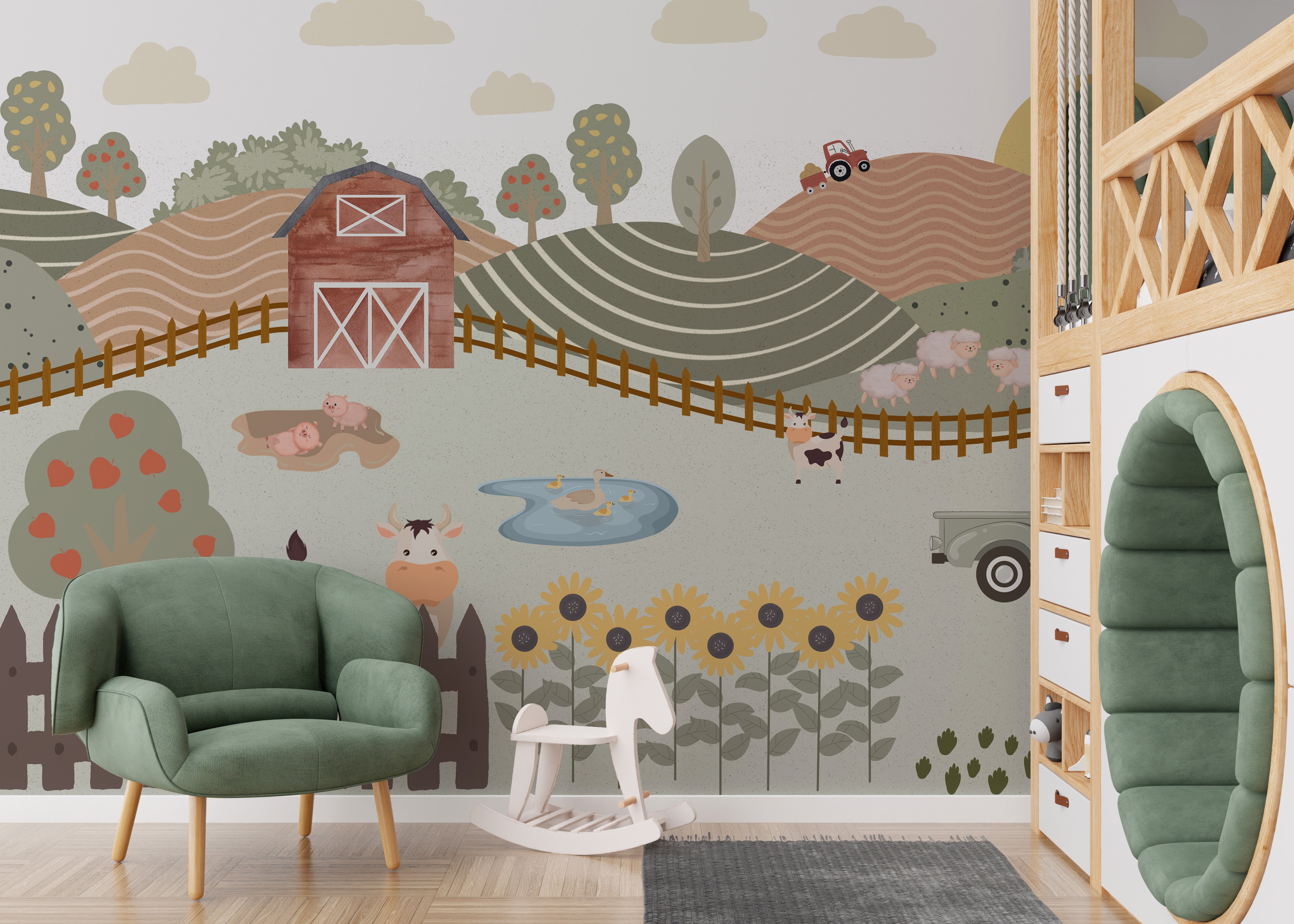 Pastel farm adventure nursery wallpaper