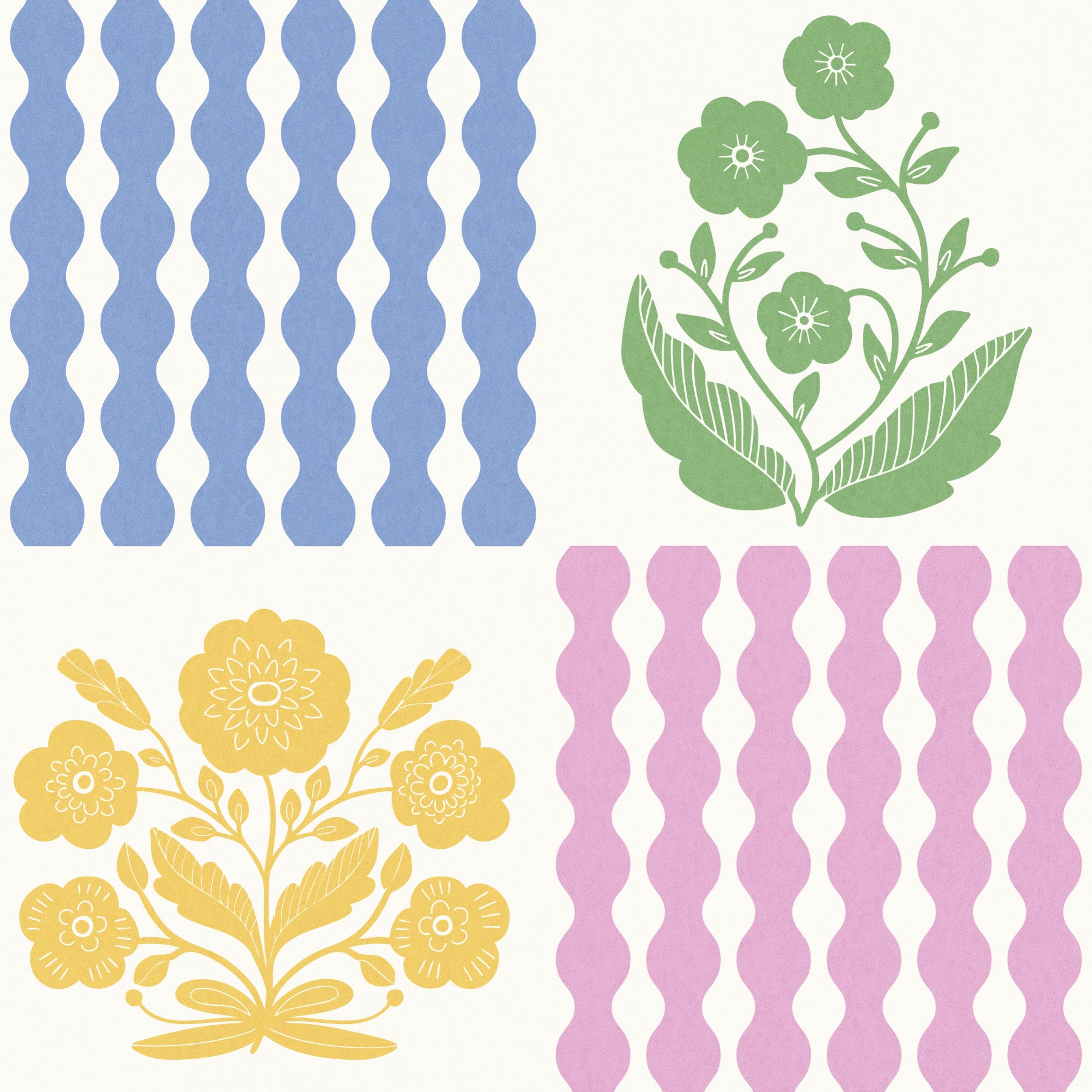 Adorn your rooms with the refreshing charm of this floral geometric design. Notice how whimsical flower bouquets and rhythmic stripes dance across a creamy backdrop, creating a sense of balance and joy. The design uses yellow, pink, green, and blue to deliver a visually stunning effect. Install this wallpaper for walls to enhance any living space, from kids' rooms to kitchens. Its balanced colors and lively patterns transform interiors with an optimistic, stylish energy that complements a variety of design styles.