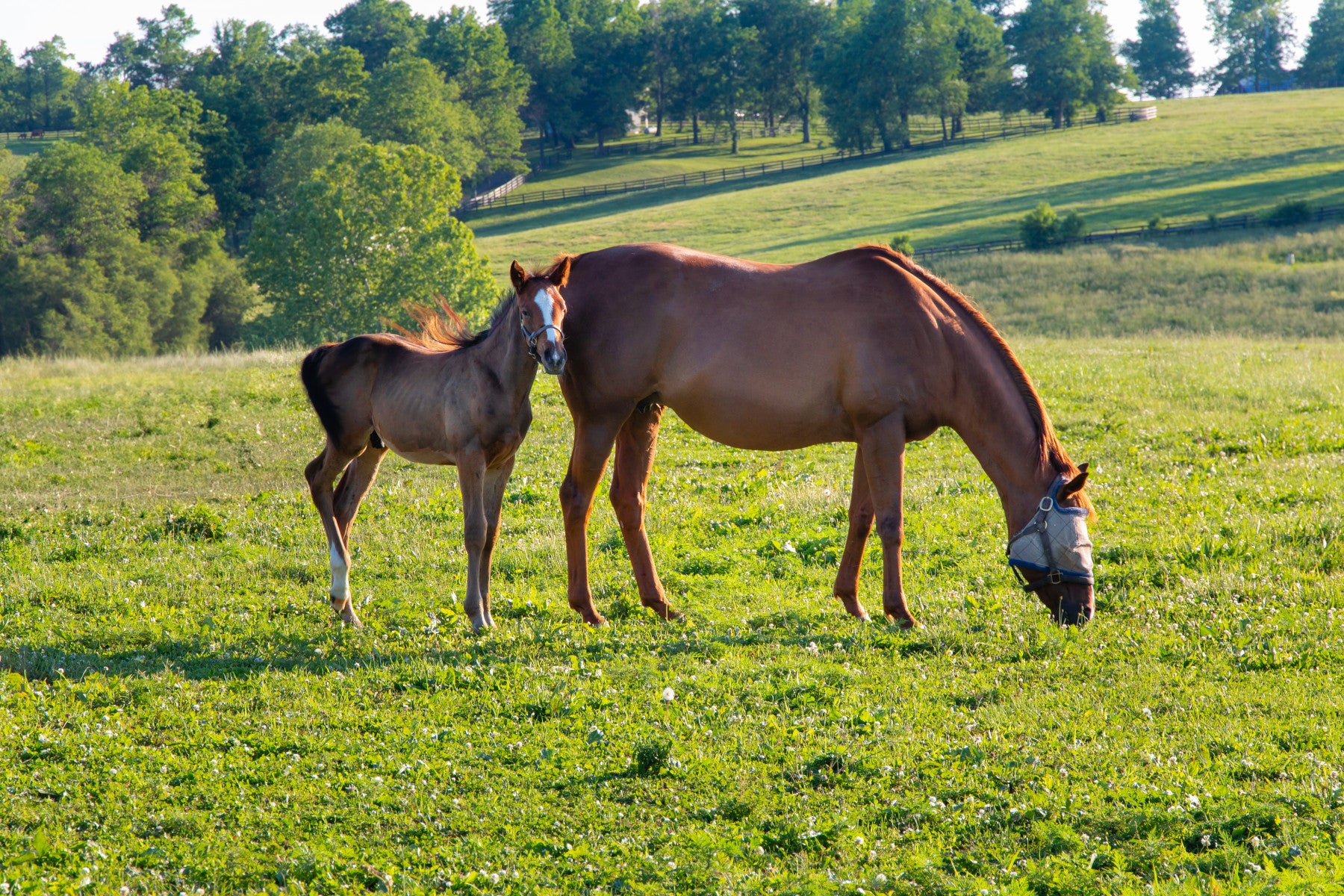 Bring a sense of countryside charm indoors with this lovely horse wallpaper. The image showcases a majestic mare and her foal grazing on a lush green pasture, bathed in soft sunlight. The natural hues and open landscape evoke feelings of peace and tranquility. Install this wallpaper for walls in a living room, bedroom, or even a home office to create a relaxed and inviting atmosphere. The serene scene instantly elevates any space with its simple yet elegant aesthetic.
