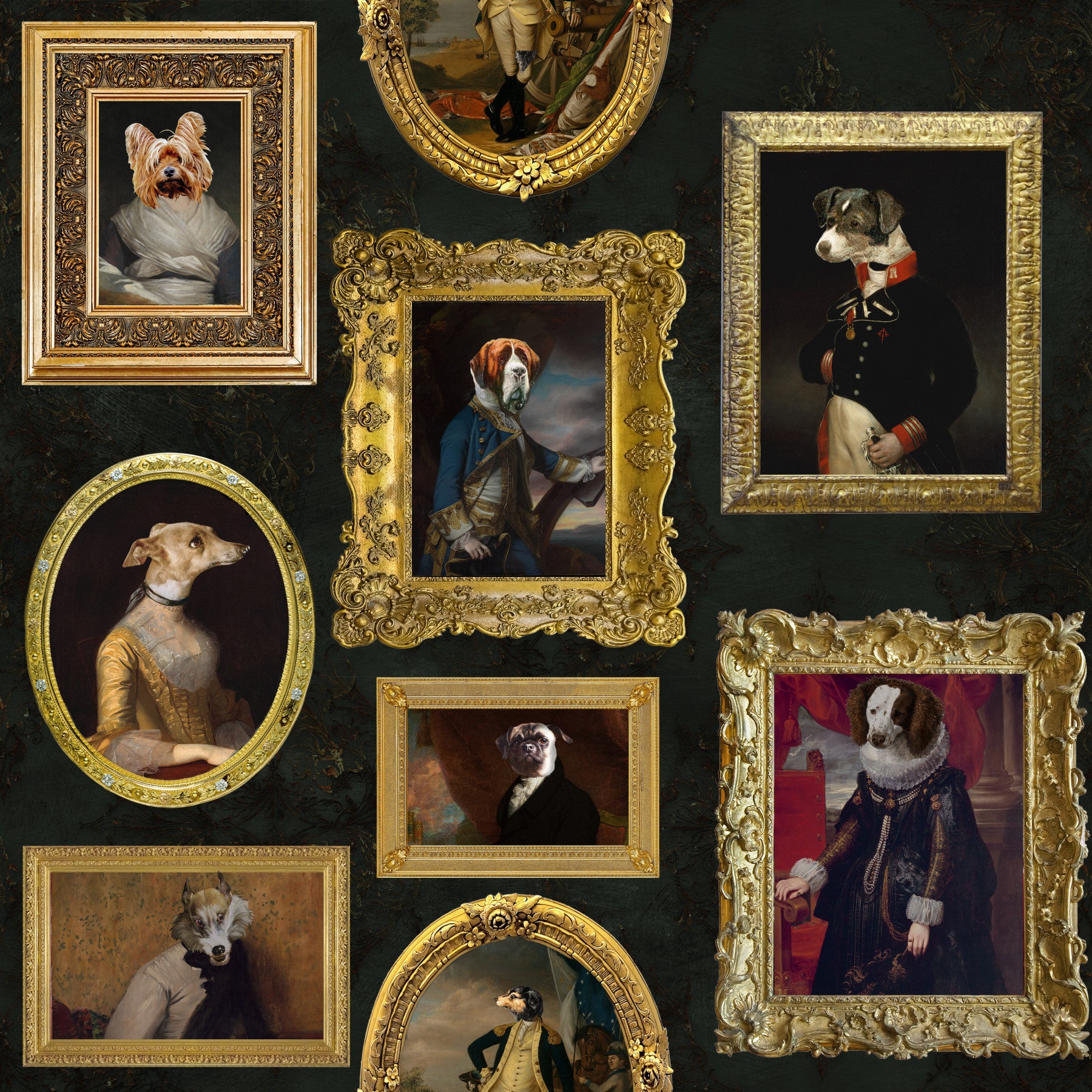 Transform any room into a gallery of refined canine artistry by Uta Naumann. This intriguing wallpaper features a series of golden frames housing dogs dressed in period clothing. A dark, subtly patterned backdrop emphasizes the golden frames. The wallpaper for walls captures the elegance of classical portraits. Its intricate details and humorous concept make it an excellent fit for a home office, library, or even a unique bedroom. The design complements interiors that appreciate a blend of tradition and whimsy.