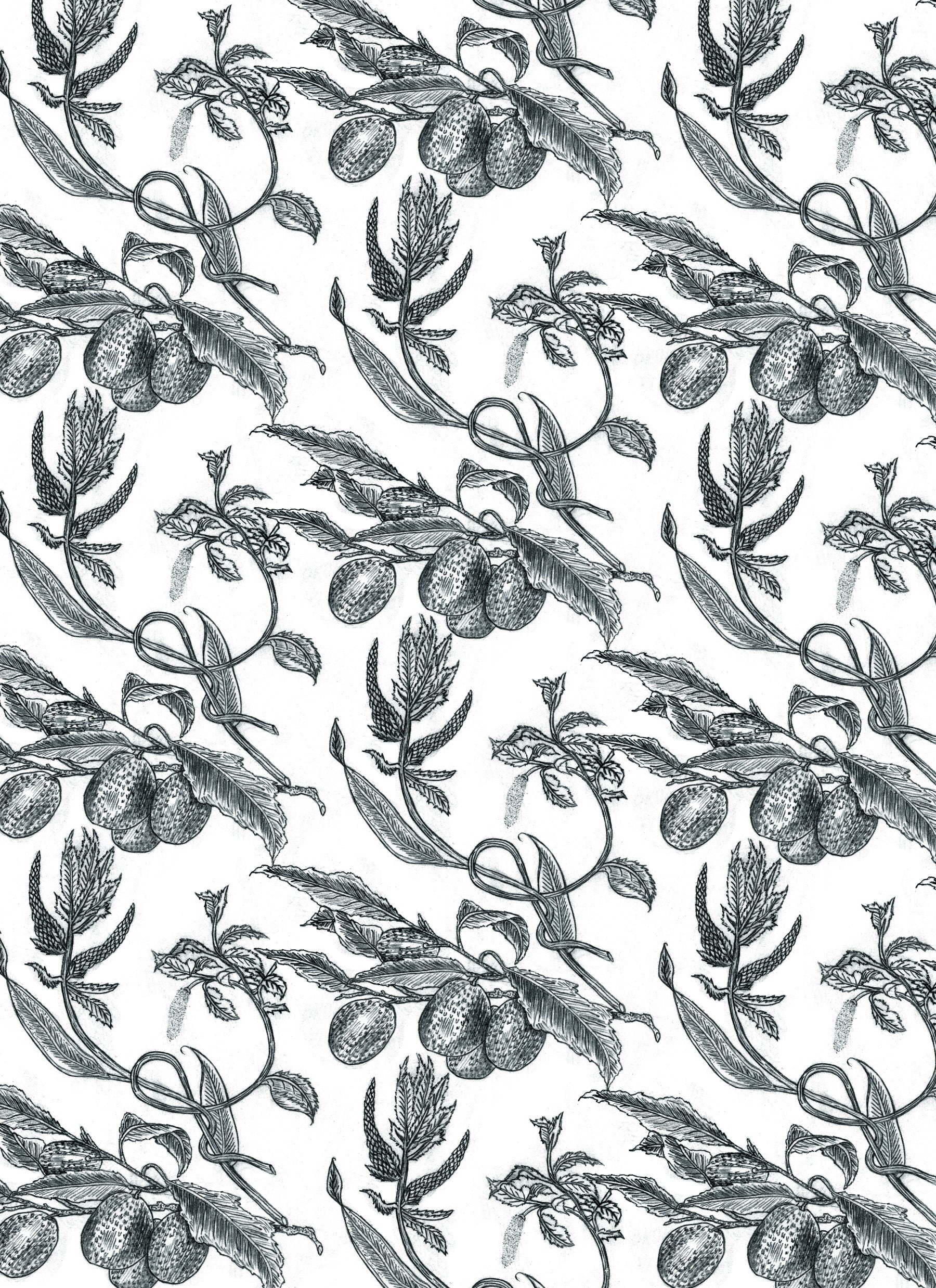 Monochrome wall mural, decorative Pé de Maracujá fruit and foliage design.