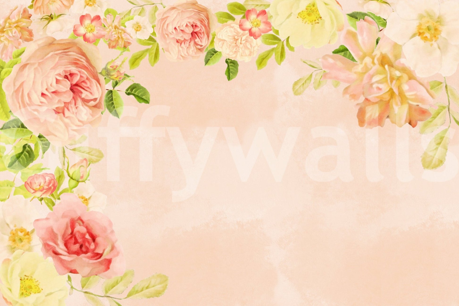 A delightful wallpaper featuring a whimsical arrangement of roses in varying shades of peach, pink, and cream. The watercolor style lends a soft, dreamy quality to the design, while the delicate rendering of the petals and leaves creates a sense of romantic charm. The overall color palette is warm and inviting, creating a peaceful and tranquil atmosphere. Perfect for a bedroom, living room, or any space where you want to evoke a feeling of calm and gentle beauty. This floral wallpaper is a timeless choice that will add a touch of elegance to any interior.