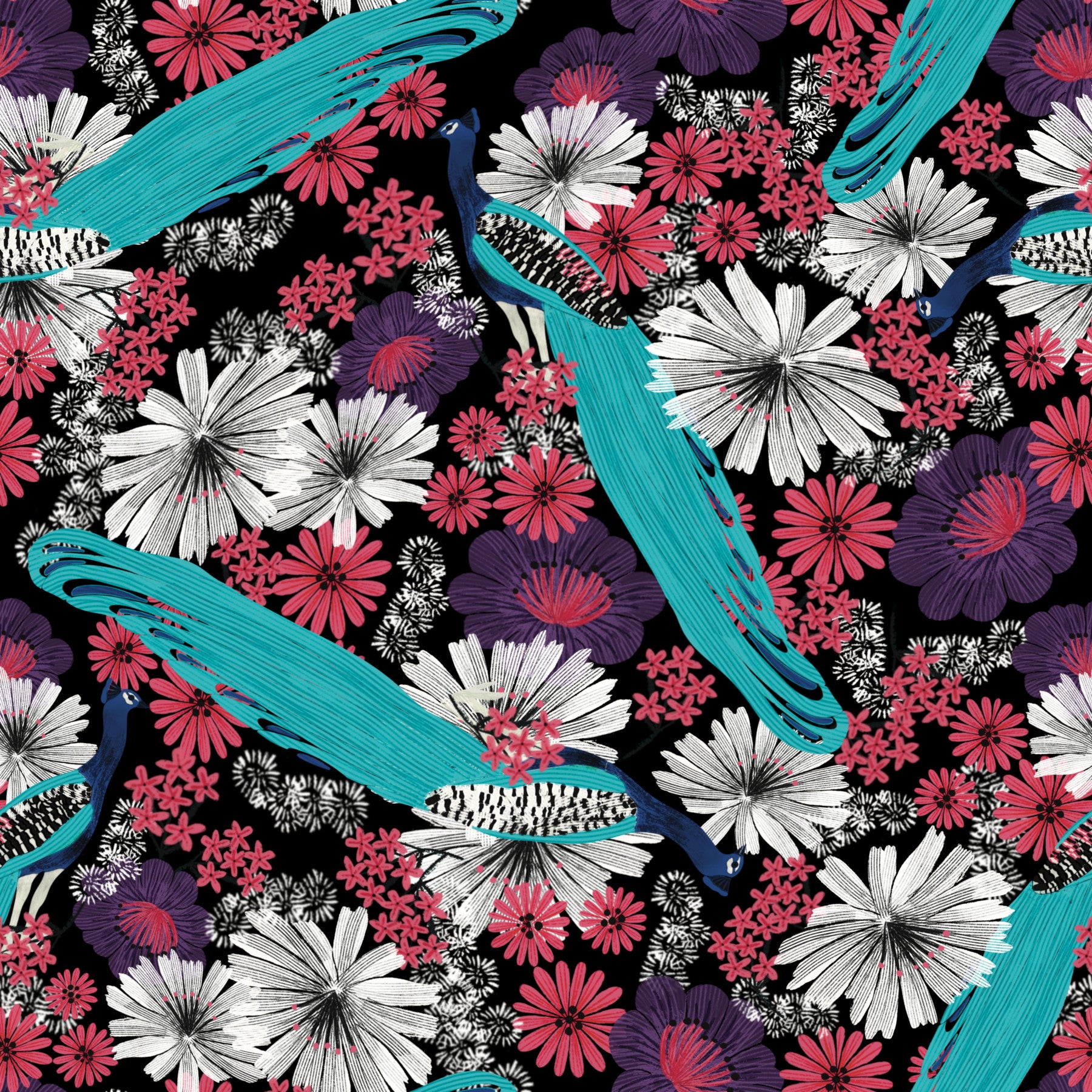 Step into a world of opulent elegance with Peacock Promenade - Black. This wallpaper design features stylized peacocks amidst a vibrant floral landscape against a sophisticated black backdrop. Turquoise-hued plumage weaves through clusters of white, pink, and violet blooms, creating a captivating contrast. The intricate details and bold color palette evoke a sense of exotic luxury and timeless beauty. Perfect for adding a touch of drama and sophistication to any space, this wallpaper transforms ordinary walls into a breathtaking display of artistry. Bring the majestic allure of a peacock's parade into your home with this stunning design.