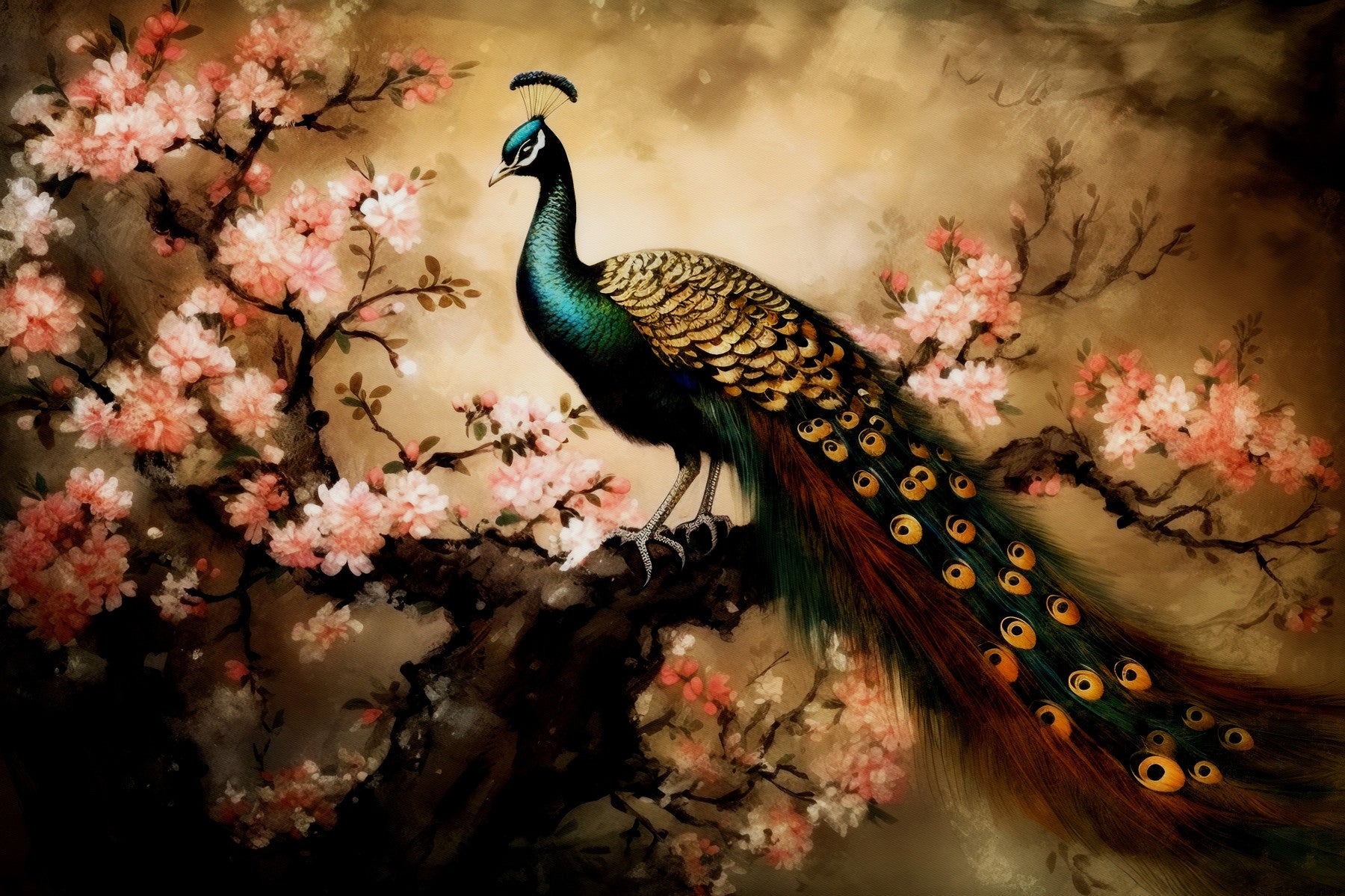 Bring a touch of elegance to your space with this sophisticated wallpaper. This design features a majestic peacock perched among blossoming branches, presented in a gentle brushstroke style. Soft pinks and warm beige hues create a serene and inviting atmosphere. Transform your living room, bedroom, or dining room with this exquisite wallpaper for walls. The delicate floral details and vibrant peacock feathers complement both modern and classic interiors, adding a touch of refined beauty.