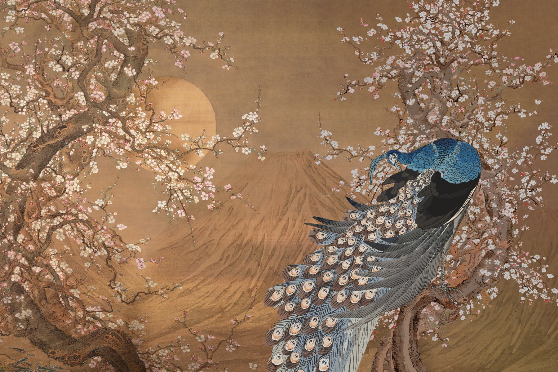This elegant design features a majestic peacock amidst blossoming trees, rendered in rich, earthy tones. Soft browns and muted blues create a peaceful, nature-inspired scene. Ideal for adding a touch of sophisticated charm, this wallpaper for walls works wonders in living rooms, bedrooms, or dining rooms. It complements interiors with its artistic flair, bringing a tranquil yet luxurious feel to any space. Embrace timeless beauty with this serene design.