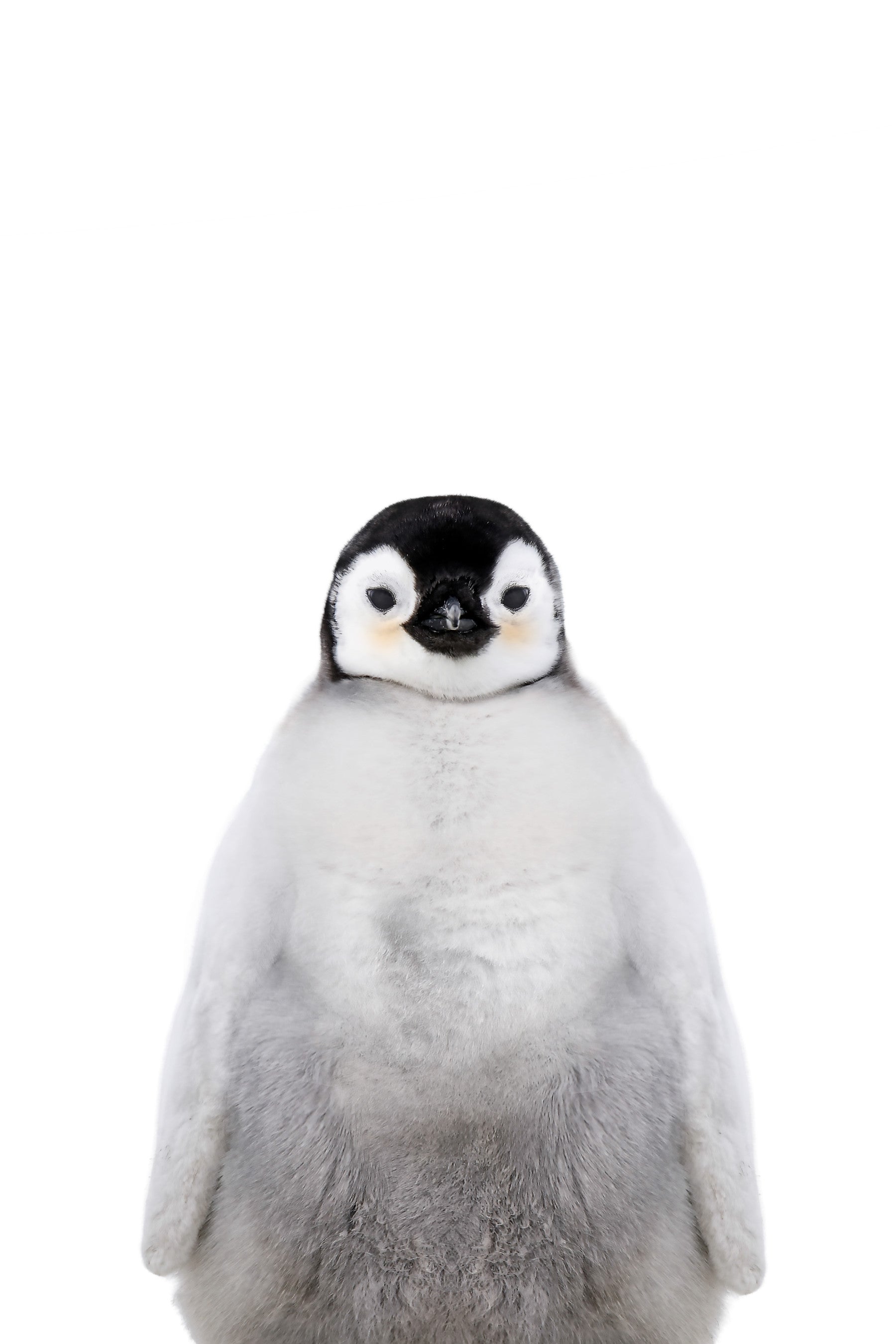 An adorable baby penguin chick, fluffy and charming, stares directly at the camera against a stark white background. Its soft, downy grey and white feathers contrast beautifully with its distinctive black head and captivating eyes. This minimalist design evokes a sense of tranquility and innocence, perfect for adding a touch of Antarctic charm to your desktop or mobile device. The image's simplicity and the penguin's endearing expression create a calming and heartwarming atmosphere, making it an ideal wallpaper for those seeking a peaceful and cute visual experience.