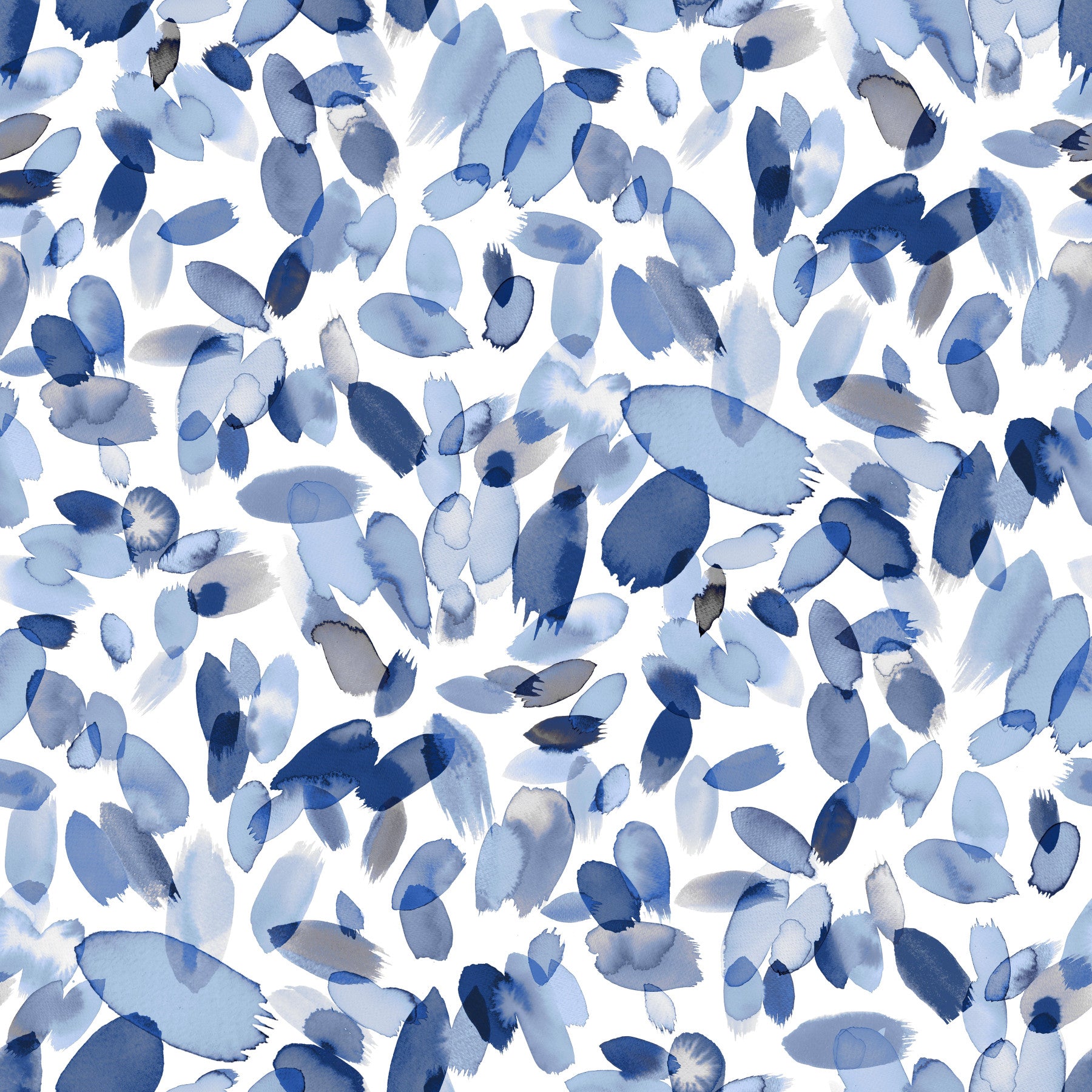 Dive into a serene world of abstract artistry with this 'Petal Watercolor Stains Abstract' wallpaper. Delicate, blue watercolor petals, rendered in shades ranging from soft sky blue to deep indigo, dance across a crisp white background. The organic shapes and soft, slightly blurred edges create a calming, ethereal mood, perfect for a space seeking tranquility and understated elegance. This design offers a sophisticated blend of texture and fluidity, making it ideal for modern and minimalist interiors. The scattered petal motif adds a touch of whimsical charm without overwhelming the overall peaceful ambiance.