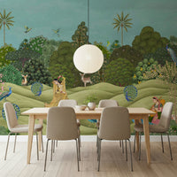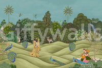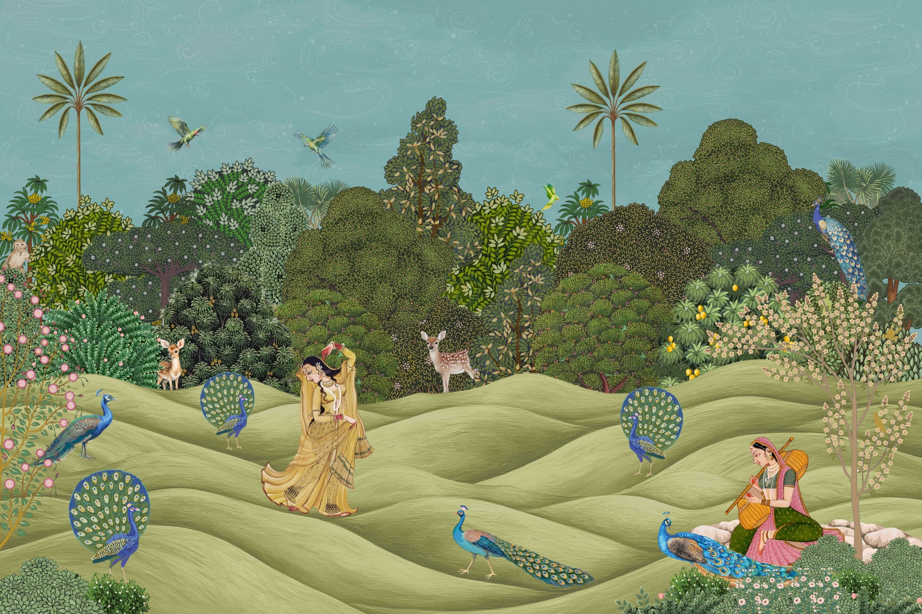 Step into an enchanting Indian oasis with 'Pichwai Palms,' a captivating wall décor that reimagines traditional artistry. Inspired by the rich heritage of Pichwai paintings, this design presents a tranquil scene of rolling green hills populated with majestic peacocks and graceful deer. Lush foliage, including stylized palm trees, creates a sense of depth and serenity, while delicate details such as the ethereal figures of a dancer and a musician add layers of cultural richness. The soft, muted color palette, dominated by serene blues and calming greens, evokes a sense of peaceful elegance. Bring a touch of timeless beauty and cultural depth to your living space with this sophisticated and visually stunning piece, transforming any room into a sanctuary of artistic charm.