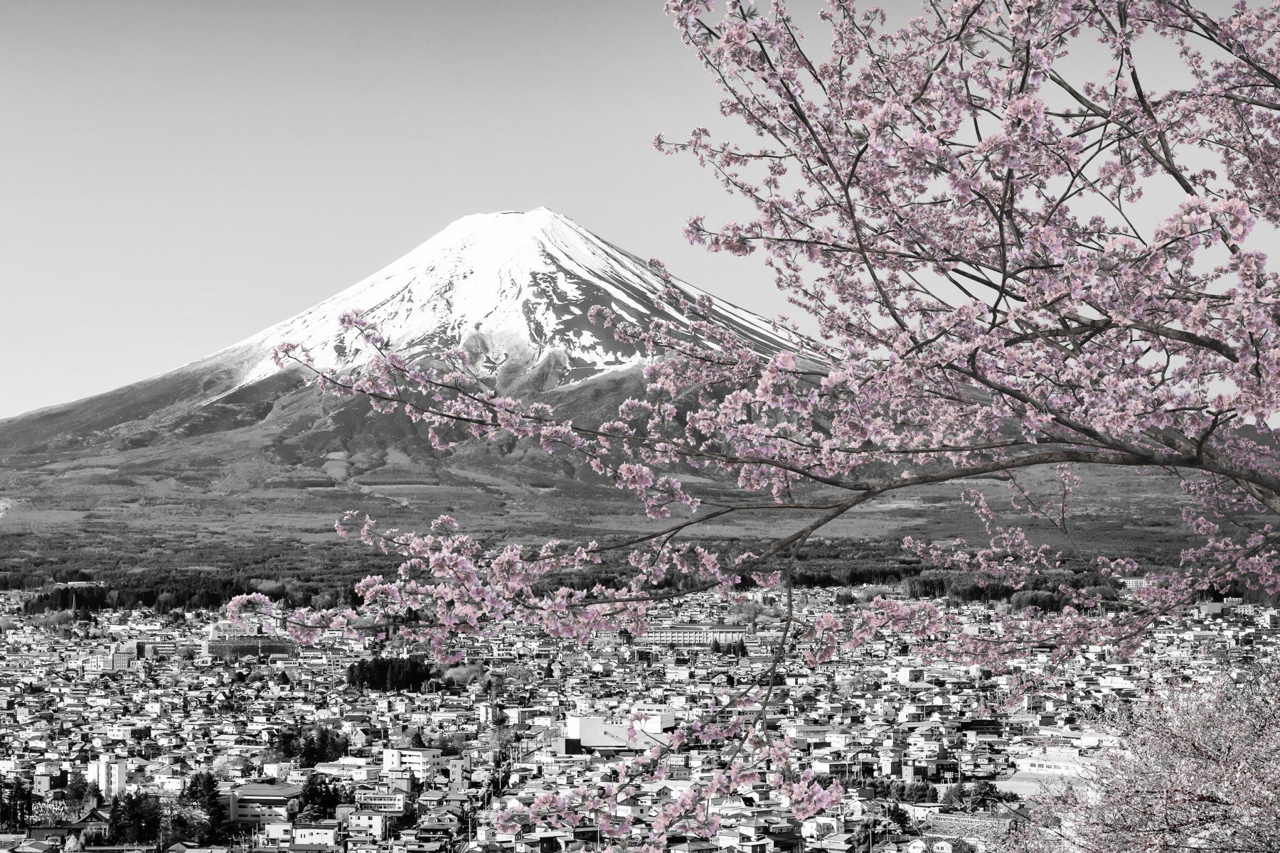 Colorkey mural showing pink blossoms against black-and-white Fuji view.