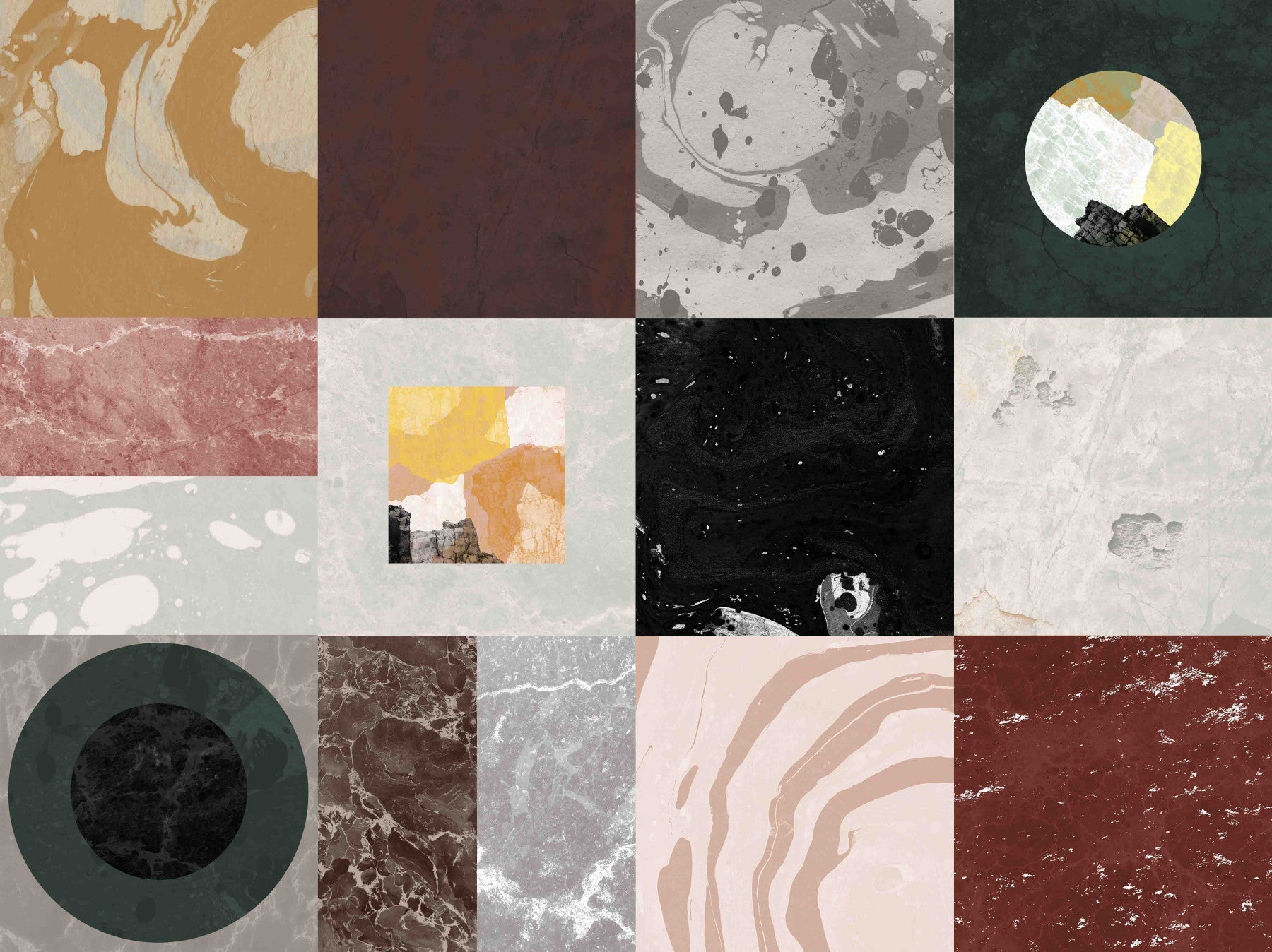 The "Pietra2 rework" wallpaper is a modern mosaic of texture and form, evoking a sense of geological exploration and artistic refinement. Divided into distinct panels, it showcases a curated selection of abstract marble patterns, solid earthy hues, and geometric shapes. The composition balances natural imperfections with deliberate design, creating a sophisticated and calming aesthetic. Earthy tones of ochre, maroon, and beige are juxtaposed with stark black and white, lending a raw yet refined quality. A minimalist circle motif recurs throughout, hinting at a connection to lunar cycles or the earth's core, grounding the entire design in a contemplative stillness.