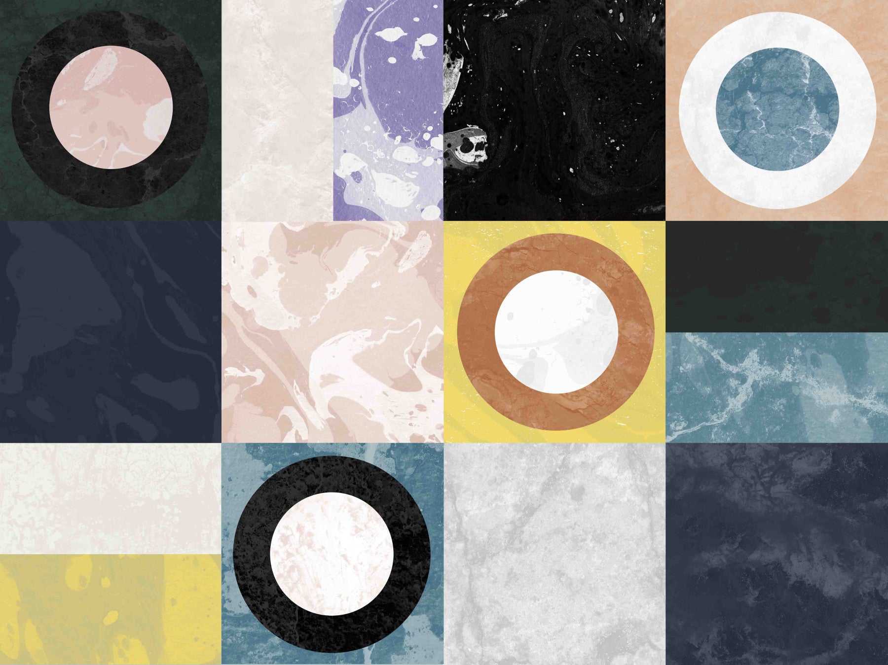 Pietra3 Wallpaper embraces a modern, minimalist aesthetic with a touch of sophisticated artistry. The design features a grid of abstract squares, each panel showcasing unique textures and a harmonious color palette. The prominent use of circular motifs, subtly embedded within the textural details, creates visual interest and depth. The 'Pietra' element evokes the natural beauty of stone, reimagined through contemporary digital art. Its diverse shades range from dark, moody blues and blacks to softer pastels and earthy tones, offering a balanced visual experience. This wallpaper is perfect for those seeking a subtly artistic and calming background with a touch of understated elegance.