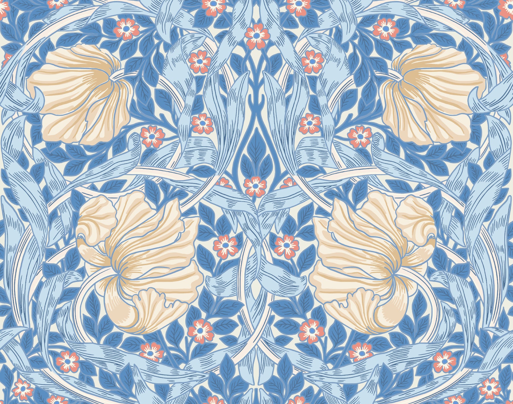 Embrace the serene elegance of "Pimpernel by William Morris 13." This captivating wallpaper showcases a breathtaking Art Nouveau design featuring stylized pimpernel blossoms in delicate peach and coral hues, nestled amongst flowing, blue-toned foliage. Intricate, linear details accentuate the graceful curves of the flowers and leaves, creating a sense of rhythm and movement across the design. The calming palette of soft blues and creams evokes a peaceful and sophisticated atmosphere, ideal for adding a touch of classic beauty to any room. Experience the timeless charm of Morris's artistry with this refined and visually stunning wallpaper.