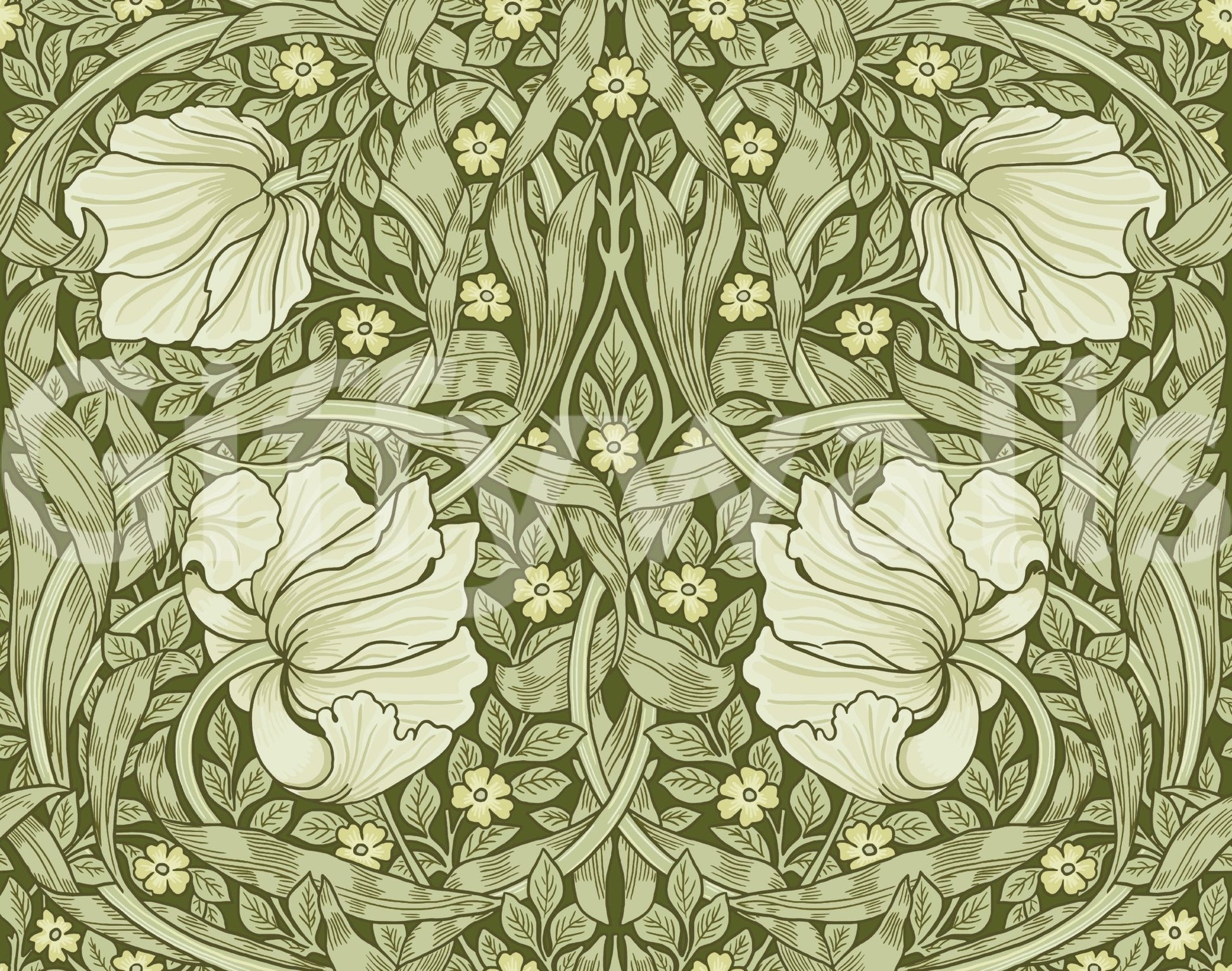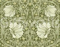 Indulge in the timeless elegance of "Pimpernel by William Morris 14." This wallpaper showcases a captivating tapestry of stylized pimpernel blossoms and lush foliage in a calming palette of olive greens and creamy whites. The intricate Art Nouveau design, featuring gracefully intertwined leaves and delicately rendered flowers, creates a sense of serene sophistication. A perfect blend of classic and modern, this wallpaper adds a touch of Victorian charm and natural beauty to any space, evoking a feeling of quiet contemplation and refined taste. The symmetrical design offers a balanced aesthetic perfect for accent walls or complete room coverage.