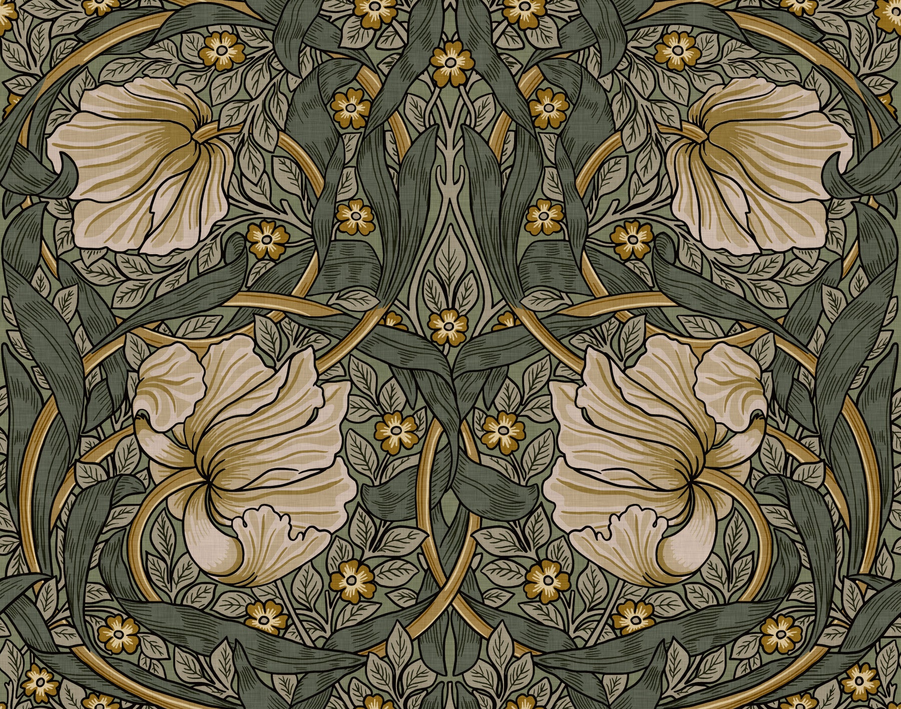 Indulge in the timeless elegance of 'Pimpernel by William Morris 2'. This wallpaper showcases a captivating tapestry of stylized pimpernel flowers and sinuous leaves, rendered in a sophisticated palette of sage greens and muted golds. The intricate, interwoven design, characteristic of Morris's Art Nouveau style, creates a sense of depth and luxurious texture. Each delicate blossom and flowing stem is meticulously detailed, offering a rich visual experience that evokes a sense of calm and refined sophistication, perfect for adding a touch of classic artistry to any digital space.