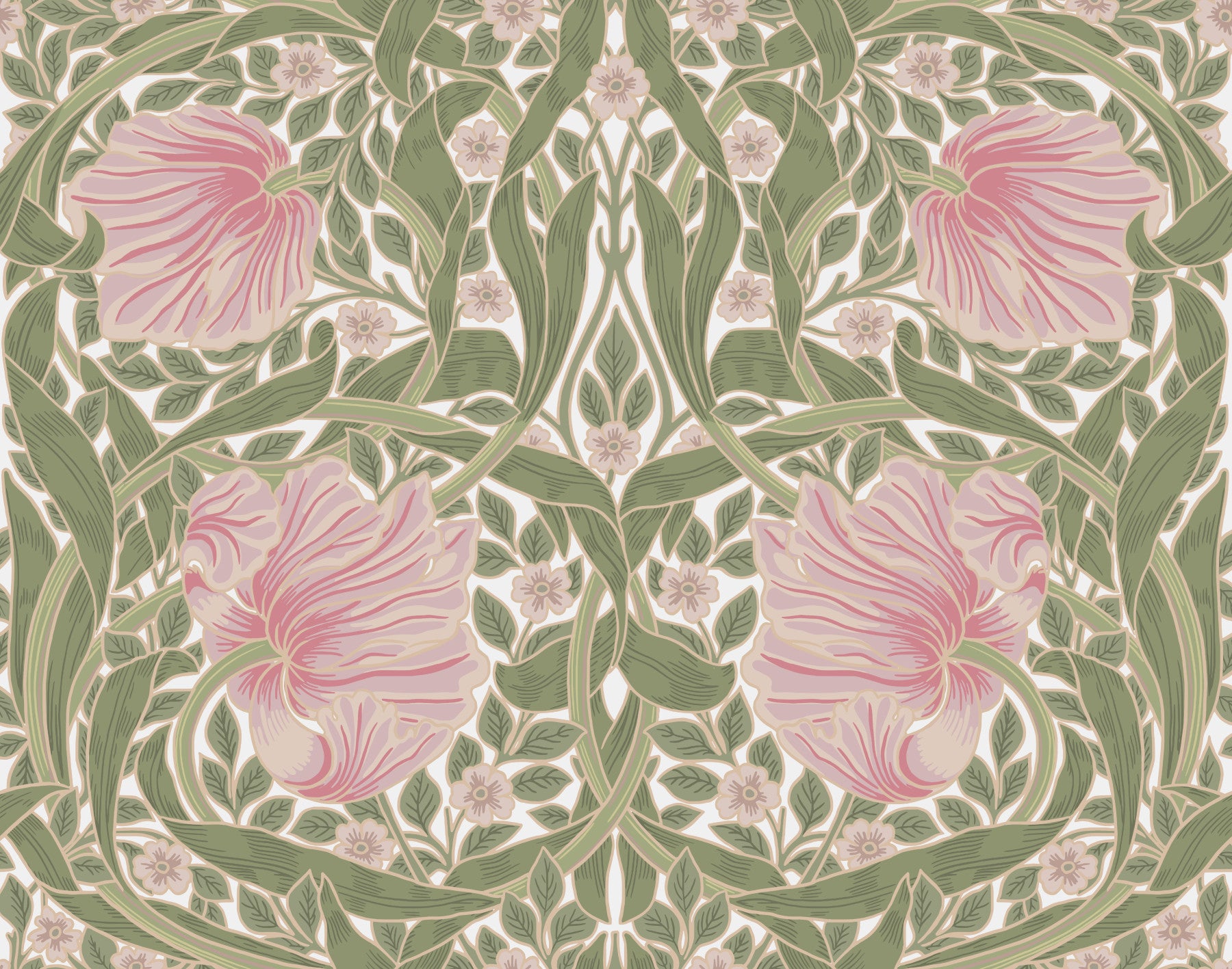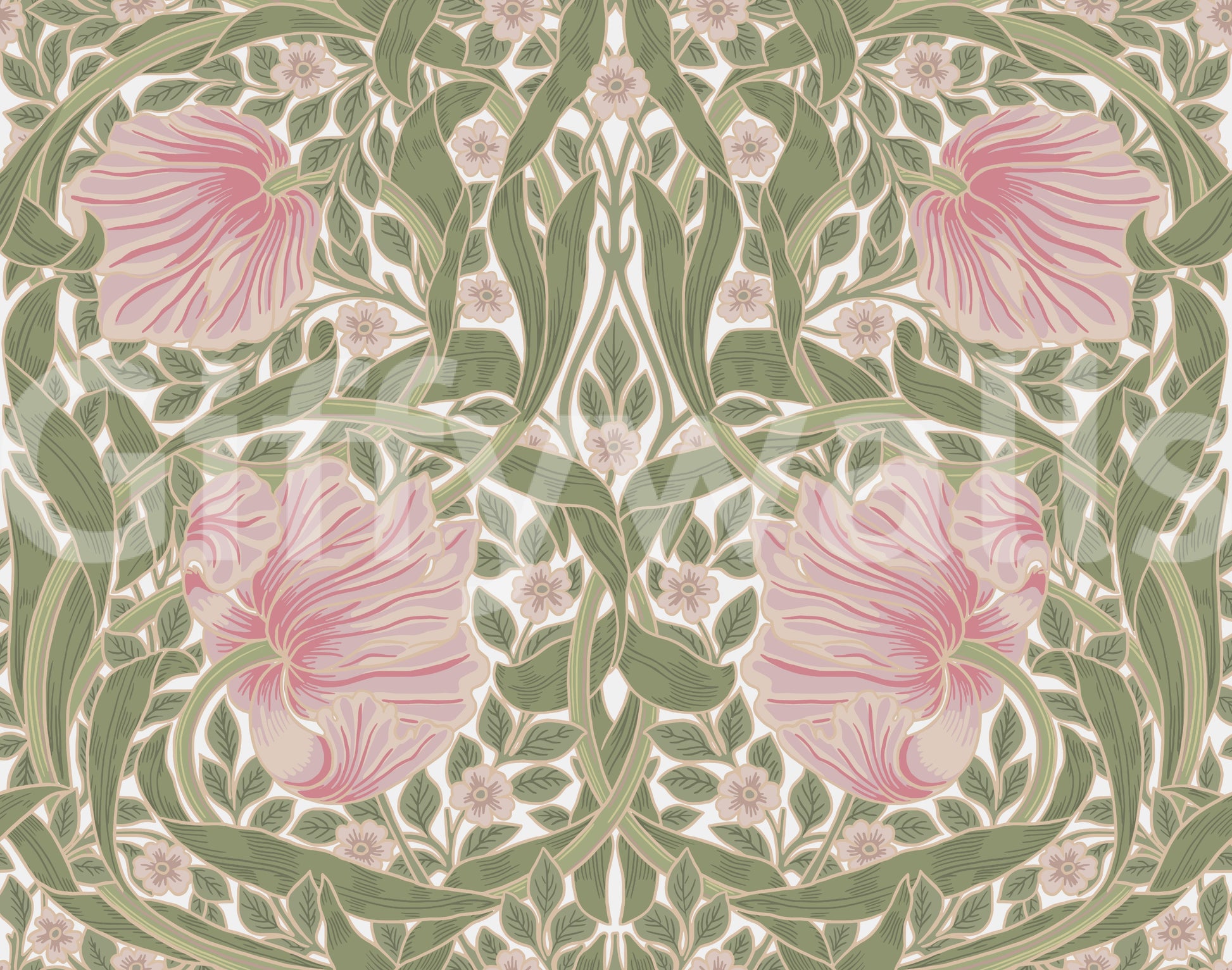 Indulge in the timeless elegance of "Pimpernel by William Morris 21." This wallpaper showcases a captivating tapestry of blush pink pimpernel blossoms intertwined with lush, verdant foliage. The intricate, Art Nouveau-inspired design features delicate detailing and a symmetrical arrangement, creating a sense of refined tranquility. Soft greens and muted pinks blend seamlessly against a creamy off-white background, offering a sophisticated and calming atmosphere. The wallpaper evokes a sense of classic beauty, perfect for adding a touch of vintage charm to any room. Its intricate floral patterns are both visually striking and soothing, making it a perfect choice for bedrooms, living rooms, or any space needing a touch of refined elegance.
